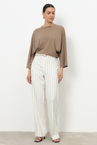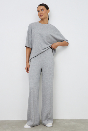 Брюки прямого силуэта из эластичного полотна. Пояс притачной с эластичной резиной. На передней части брюк застрочены стрелки.