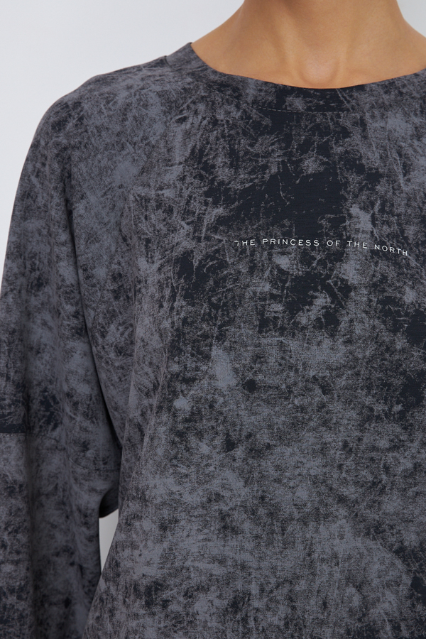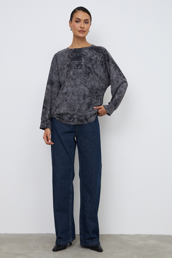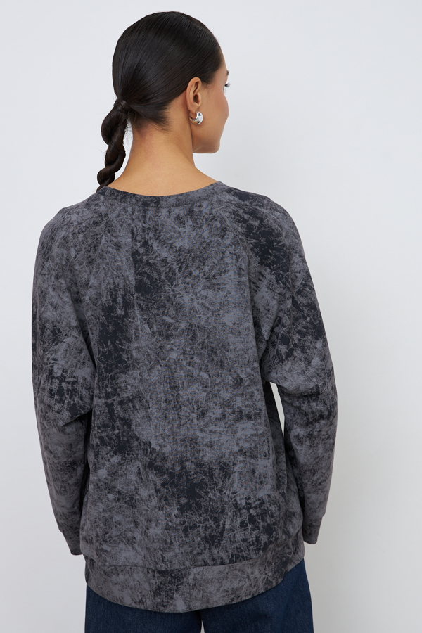 Свитшот свободного силуэта из эластичного полотна. Круглый вырез горловины оформлен бейкой. Рукав реглан с горизонтальным швом в области локтевого сгиба. По низу изделия и рукавов выполнены притачной пояс и манжеты из основной ткани. В таблице размеров представлены параметры человека, а не изделия.