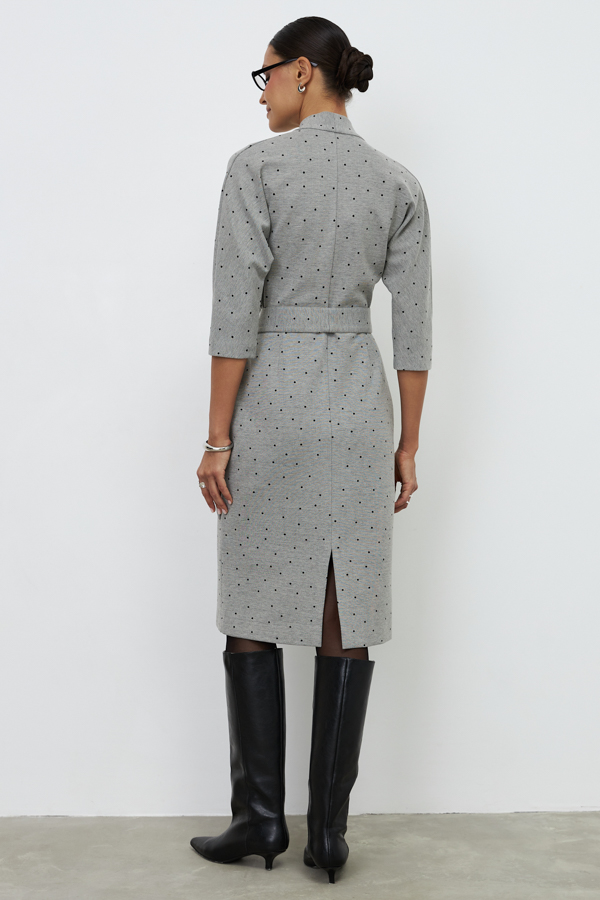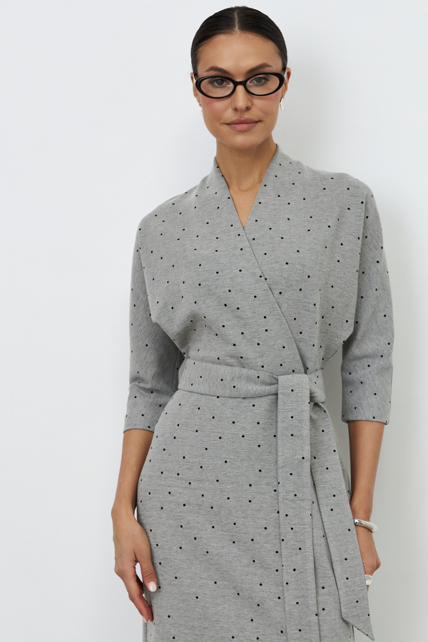 Платье из эластичного полотна. Изделие свободное в верхней части и прилегающее в области талии и бёдер. Лиф изделия оригинального кроя в стиле кимоно. Цельнокроеная стойка переходящая в запах, визуально делает фигуру стройнее. По центру задней части платья выполнен шов, снизу небольшой разрез. В комплекте пояс. В таблице размеров представлены параметры человека, а не изделия.