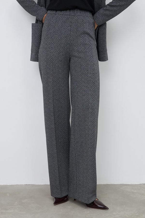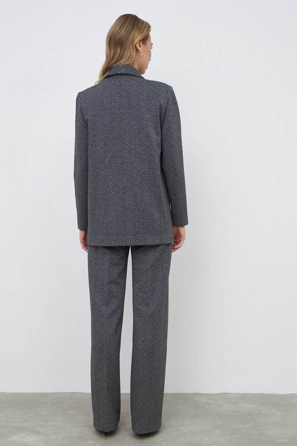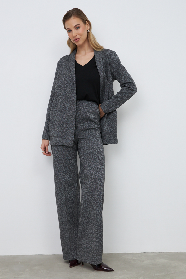 Костюм из эластичного полотна. Брюки прямого силуэта. Пояс с эластичной резиной. Жакет прямого свободного кроя с женственным шалевым воротником. На передней части изделия застёжка на пуговицу и накладные карманы. Втачной рукав. Изделие с плечевыми накладками, которые при желании можно убрать.
