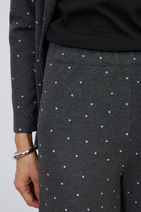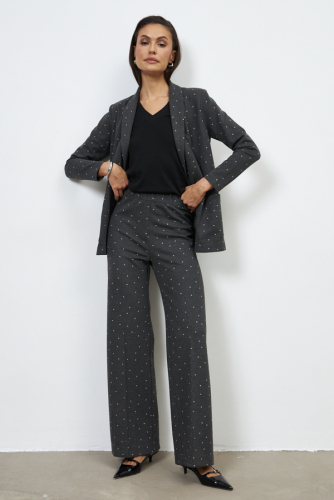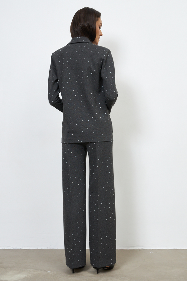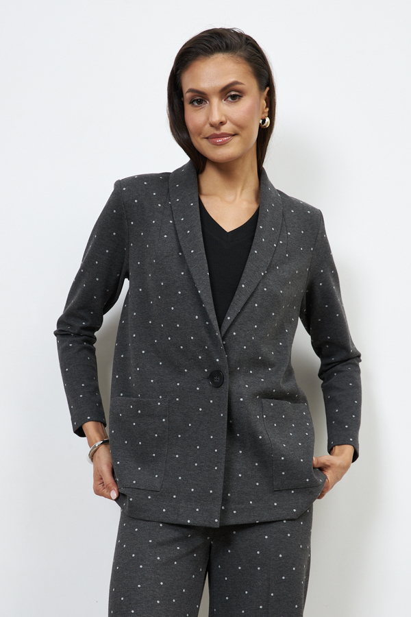 Костюм из эластичного полотна. Брюки прямого силуэта. Пояс с эластичной резиной. Жакет прямого свободного кроя с женственным шалевым воротником. На передней части изделия застёжка на пуговицу и накладные карманы. Втачной рукав. Изделие с плечевыми накладками, которые при желании можно убрать.