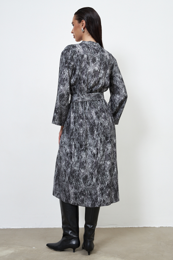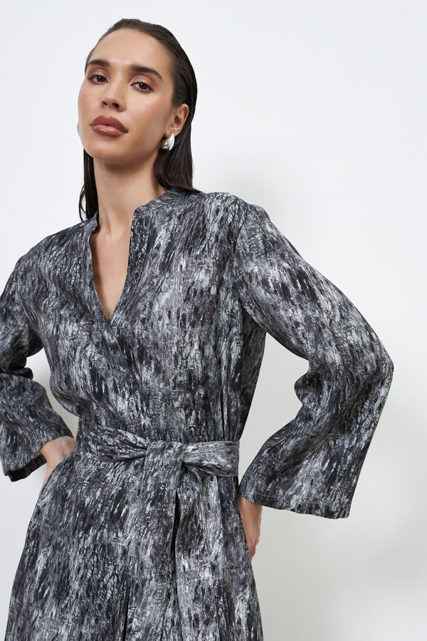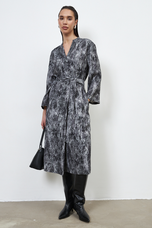 Платье из вискозной ткани свободного силуэта. Изделие отрезное по линии талии с резинкой. Лиф платья с запахом, фиксируется на пуговицу для удобства. На передней части юбки выполнена складка, имитирующая запах, в боковых швах карманы. Линия горловины оформлена воротником-стойкой. Втачной длинный рукав. В комплекте пояс из основной ткани.