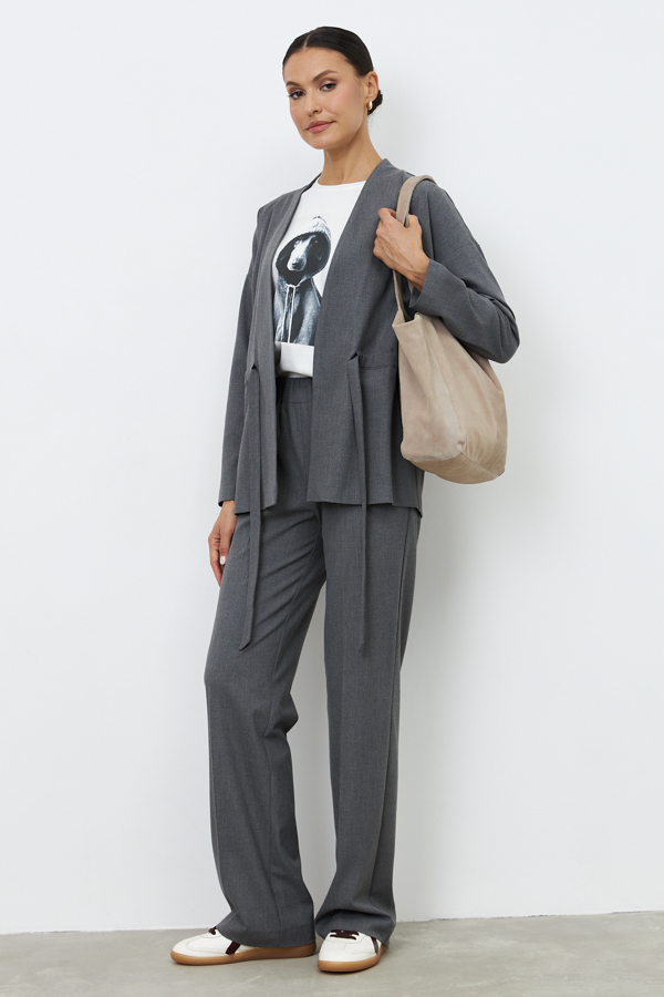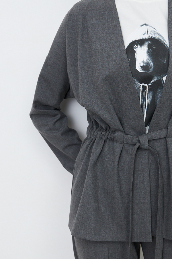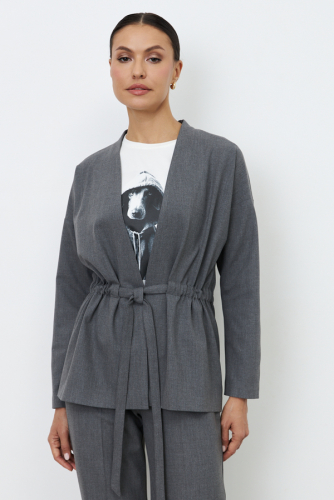 Жакет из костюмной ткани свободного силуэта. По линии талии изделие затягивается на кулиску. Цельнокроеная стойка, переходящая в борт, визуально делает фигуру стройнее. Втачной длинный рукав в спущенную пройму.