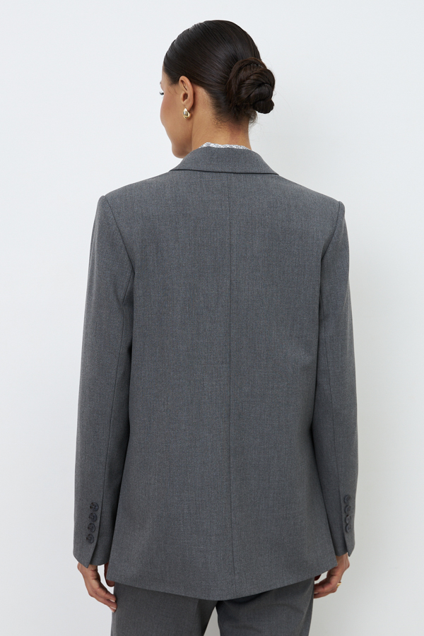 Жакет из костюмной ткани. Прямой силуэт с разрезами в боковых швах. Изделие с английским воротником и застежкой на пуговицу. На передней части жакета выполнен нагрудный карман с листочкой и карманы в рамку. Втачной длинный рукав, снизу шлица с пуговицами. Изделие идеально держит форму, имеет четкую линию плеча благодаря плечевым накладкам. Жакет на подкладке.