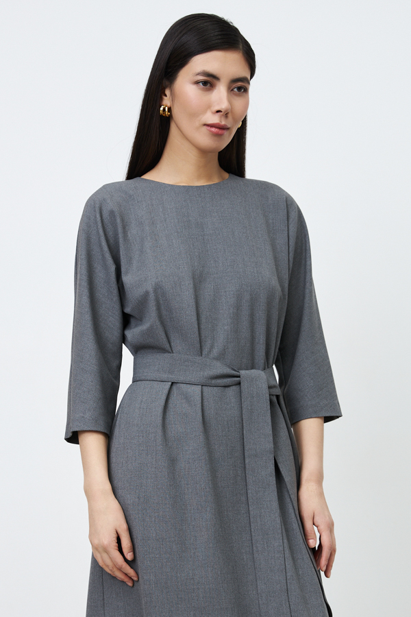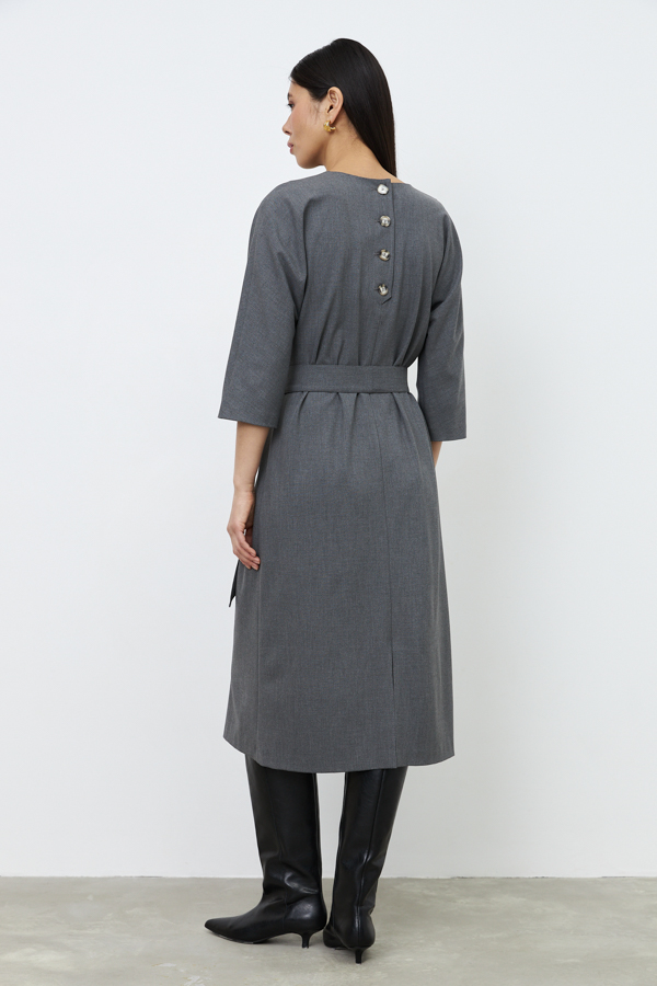 Платье из плательной ткани. Свободный силуэт, слегка прилегающий в области бедра. По спинке изделия выполнена застёжка на декоративные пуговицы, снизу-разрез. Цельнокроеный рукав 3/4. Круглый вырез горловины. В комплекте пояс, позволяющий создавать приталенный силуэт.
