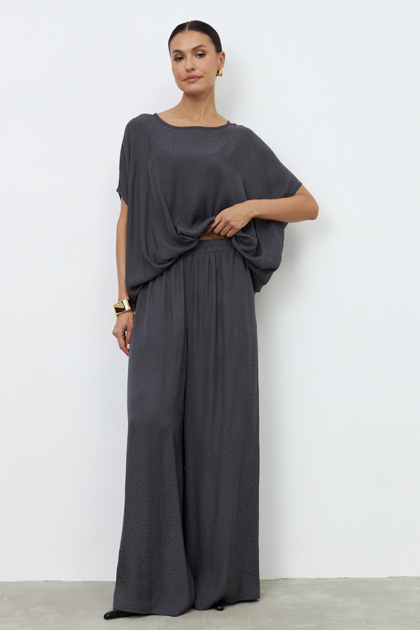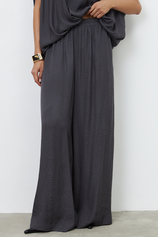 Брюки из вискозной ткани свободного силуэта. Пояс с эластичной резиной, в боковых швах карманы.