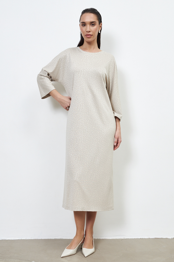 Платье из эластичного полотна полуприлегающего силуэта. Спинка со средним швом, снизу разрез. Цельнокроеный рукав в стиле кимоно. Круглый вырез горловины оформлен бейкой. В комплекте пояс из основной ткани. В таблице размеров представлены параметры человека, а не изделия.
