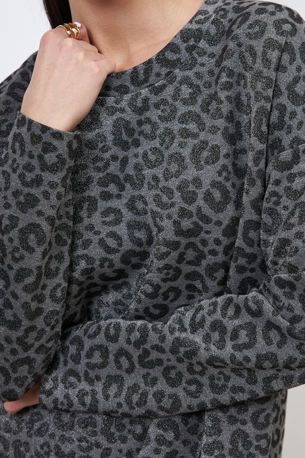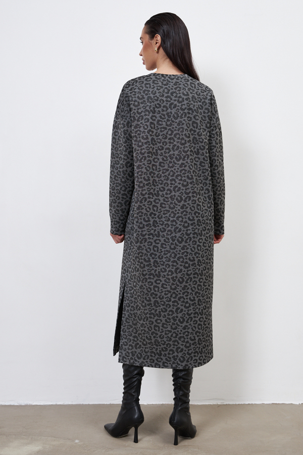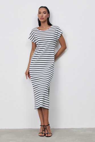 Платье из эластичного полотна свободного силуэта с разрезом в боковом шве. Изделие со спущенной линией плеча и длинным рукавом. Вырез горловины оформлен бейкой из основной ткани. В таблице размеров представлены параметры человека, а не изделия.