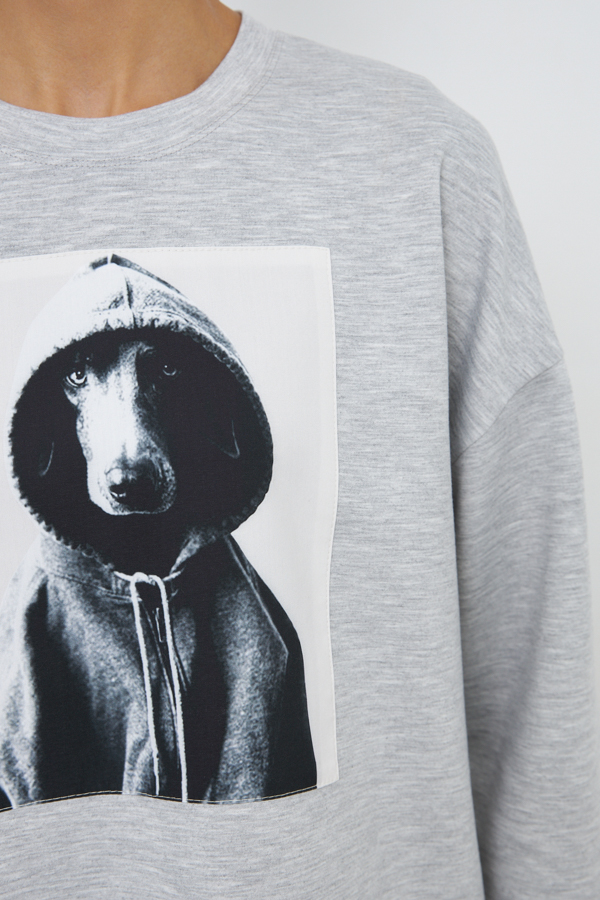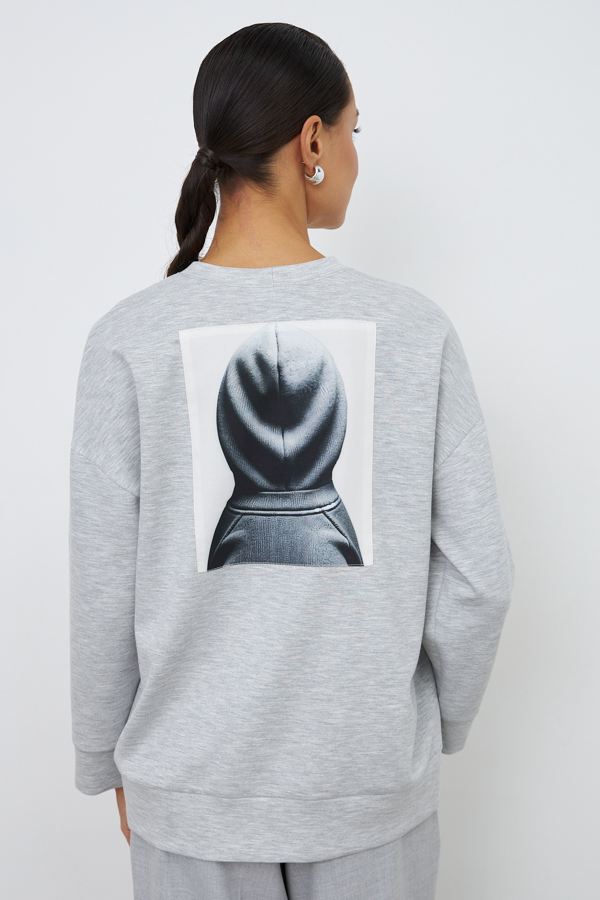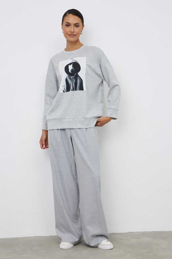 Джемпер из эластичного полотна свободного силуэта. Втачной длинный рукав в спущенную пройму. Круглый вырез горловины оформлен бейкой. По низу изделия и рукавов выполнены притачной пояс и манжеты из основной ткани. На передней и задней части изделия выполнена аппликация. В таблице размеров представлены параметры человека, а не изделия.