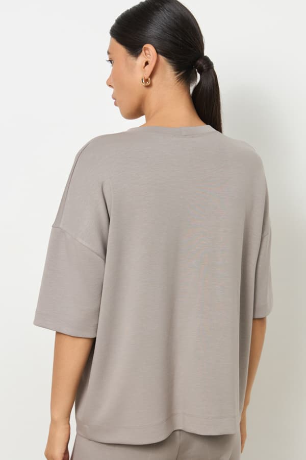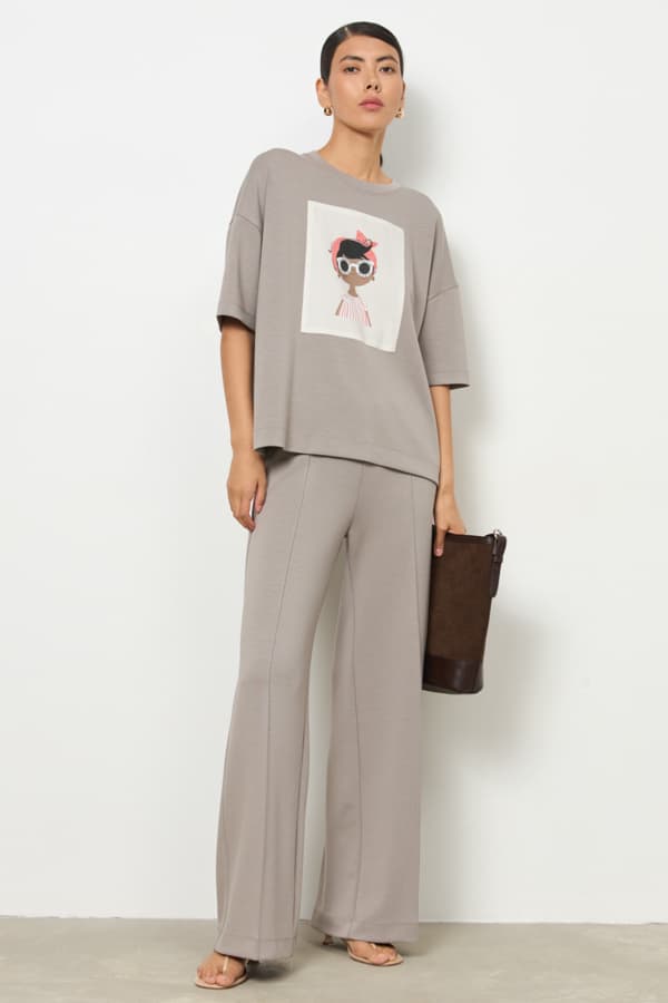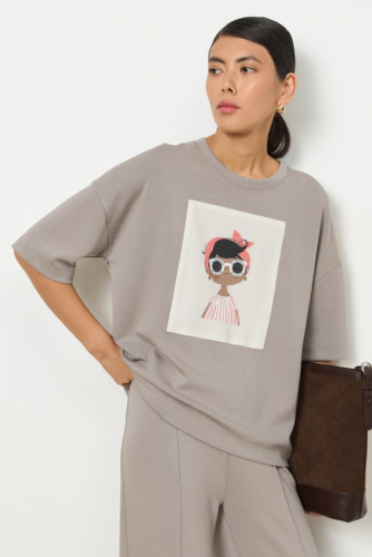 Джемпер из эластичного полотна свободного силуэта. Изделие со спущенной линией плеча и коротким рукавом. Вырез горловины оформлен бейкой из основной ткани. На передней части изделия выполнена аппликация. В таблице размеров представлены параметры человека, а не изделия.