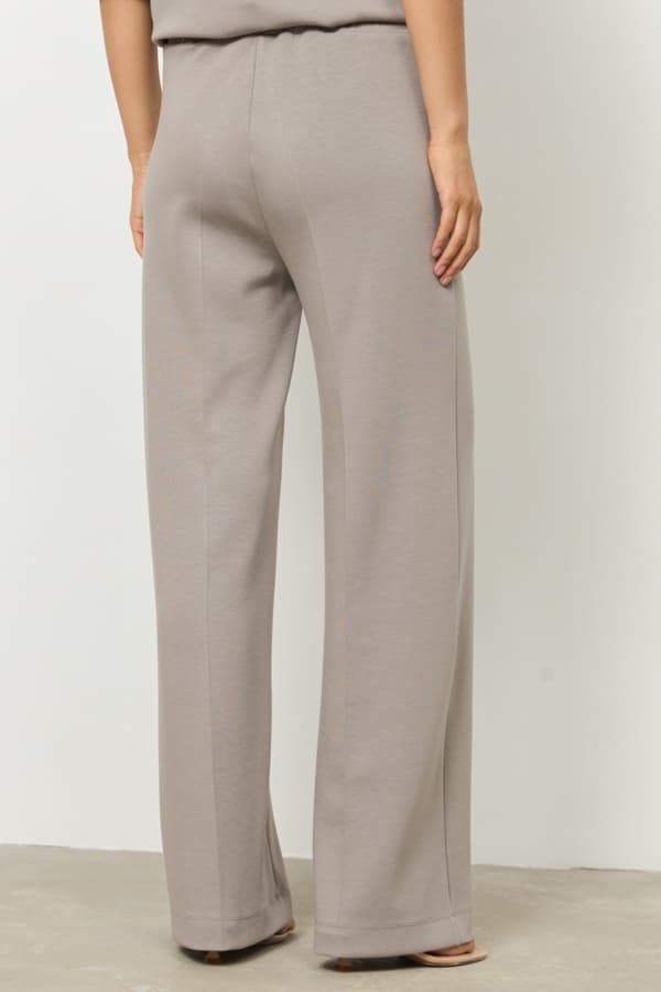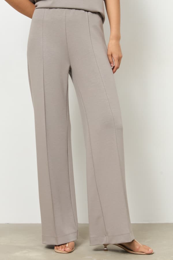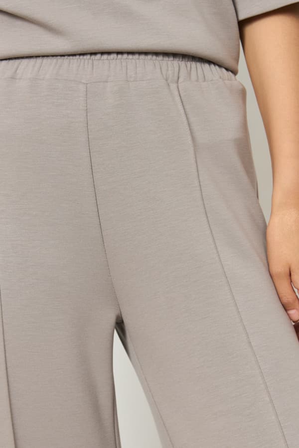Брюки из эластичного полотна прямого силуэта. Пояс притачной с эластичной резинкой. На передней части брюк застрочены стрелки.