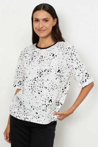 Джемпер из эластичного полотна свободного силуэта. Изделие со спущенной линией плеча и коротким рукавом. Вырез горловины оформлен бейкой из основной ткани. На передней части изделия выполнена аппликация. В таблице размеров представлены параметры человека, а не изделия.