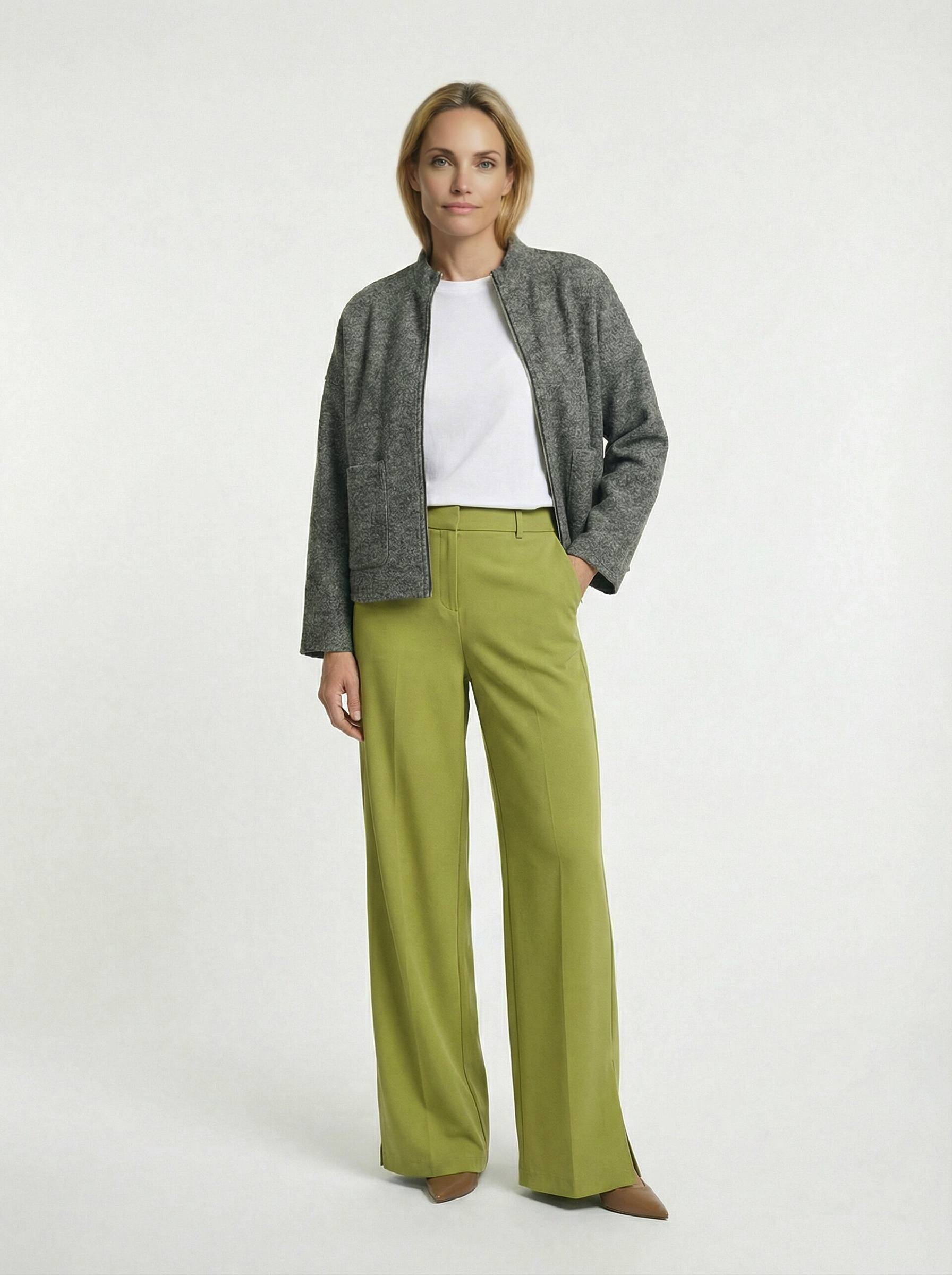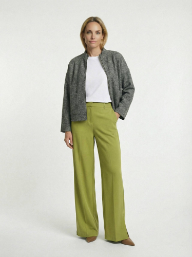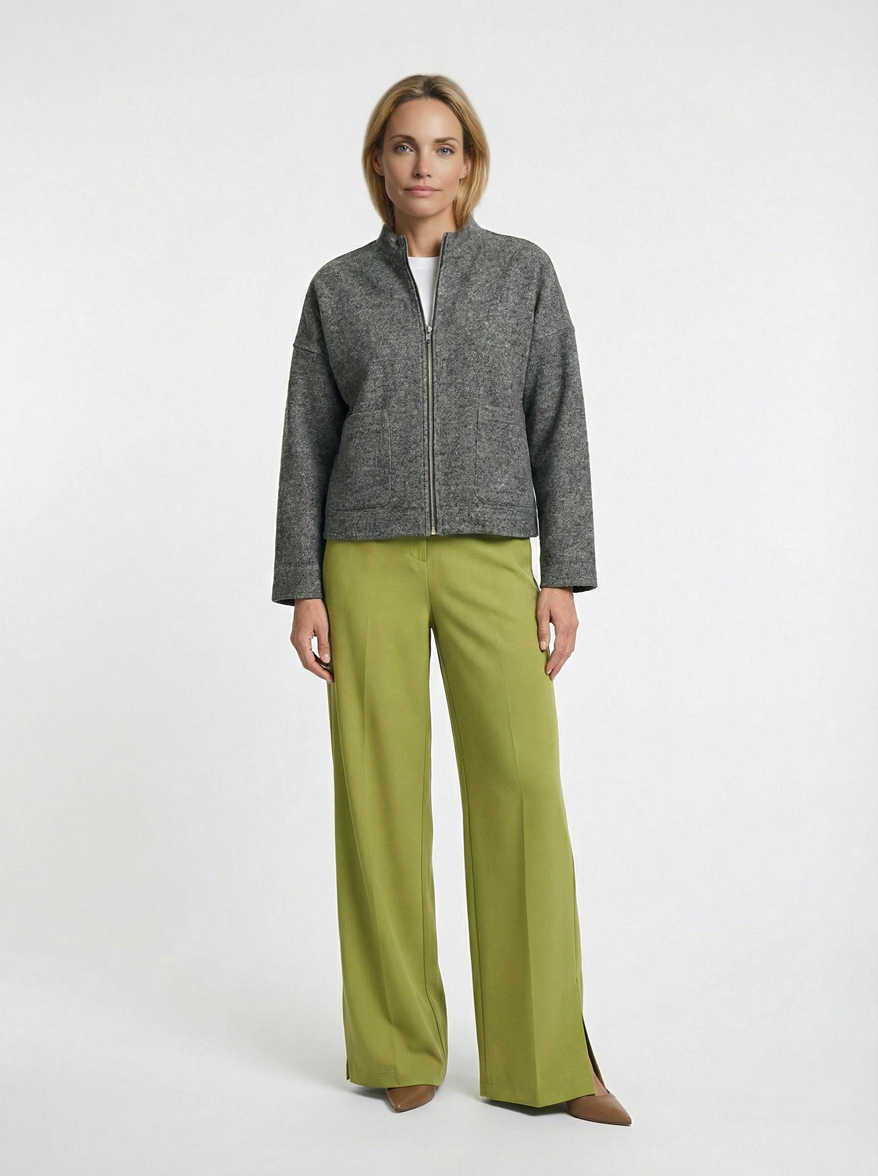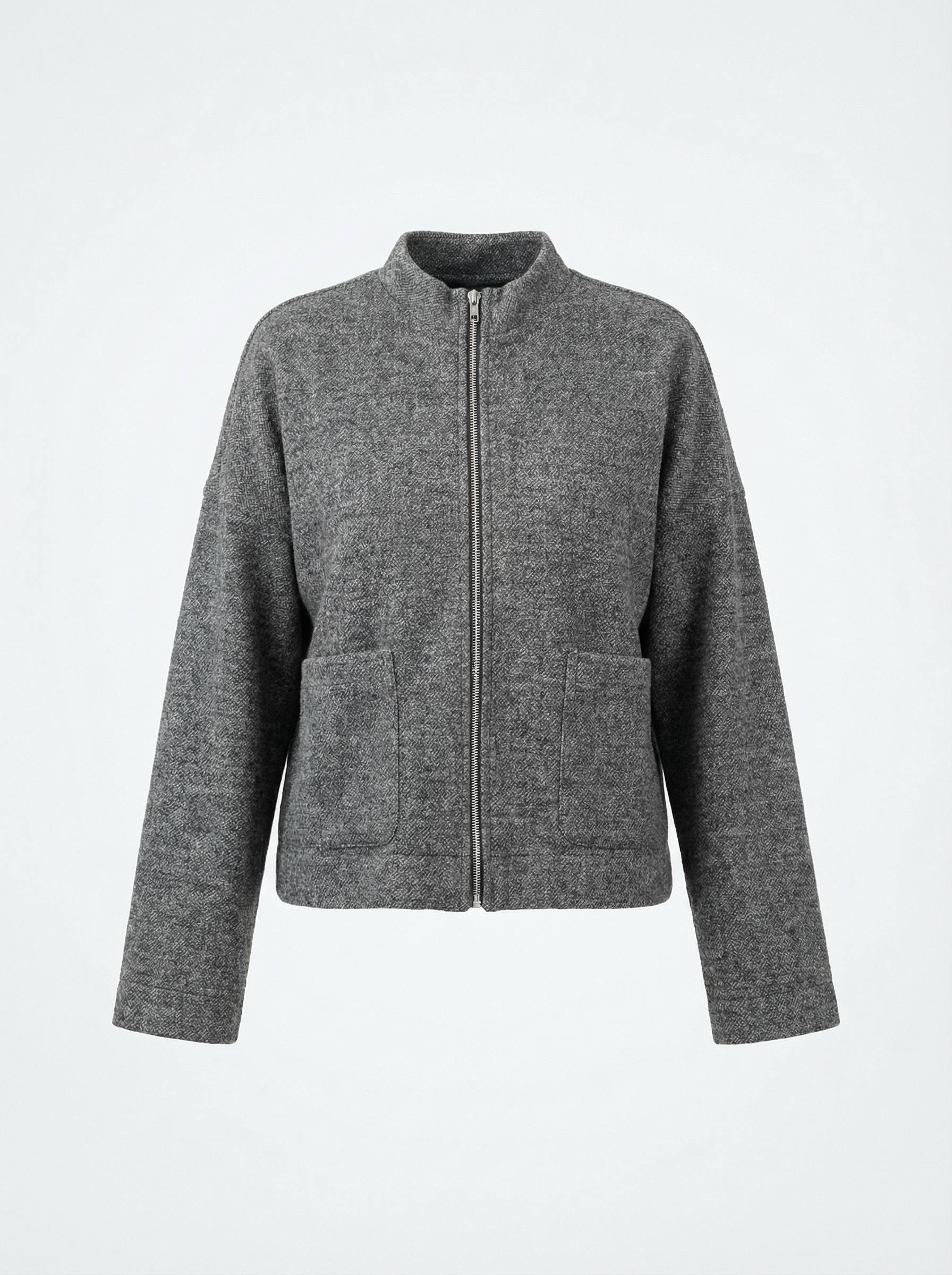 Жакет на молнии из буклированной ткани свободного силуэта. На передней части изделия выполнены накладные карманы. Втачной рукав в спущенную пройму. Линия горловины оформлена воротником-стойкой.