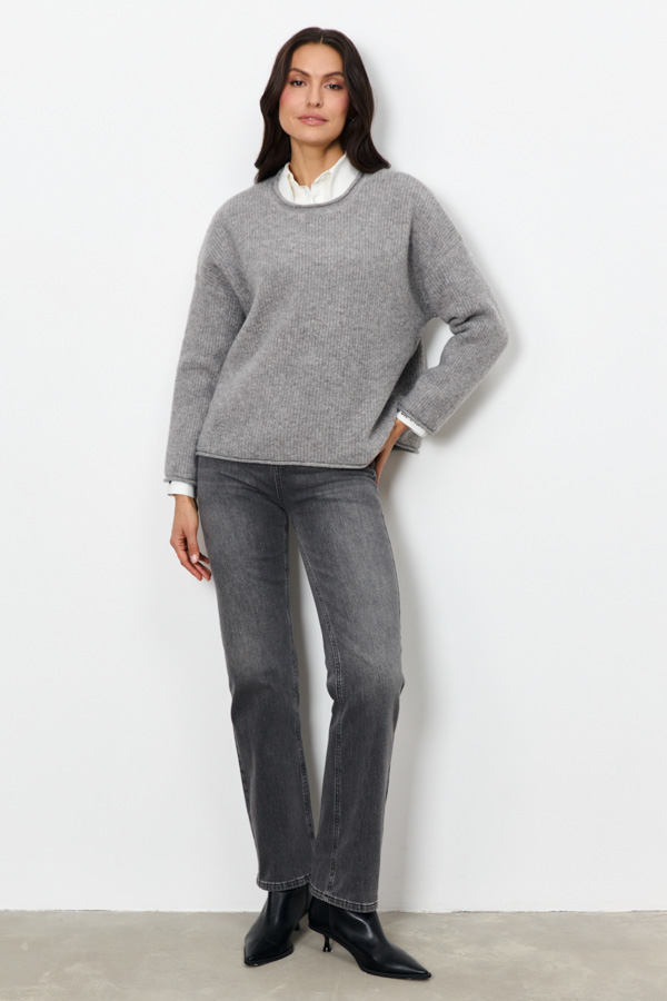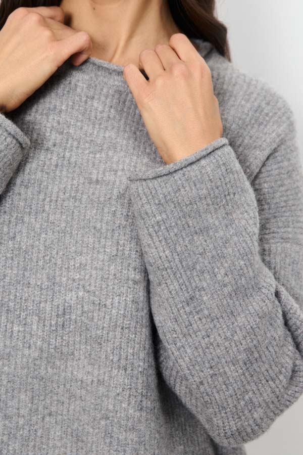 Этот джемпер – воплощение комфорта и стиля. Его свободный силуэт и мягкая фактура в рубчик создают расслабленный, но элегантный образ. Длинные рукава со спущенной проймой добавляют непринужденности. Круглый вырез горловины, низ рукавов и низ изделия оформлены аккуратной резинкой с руликом. Изделие выполнено из меланжевой пряжи.