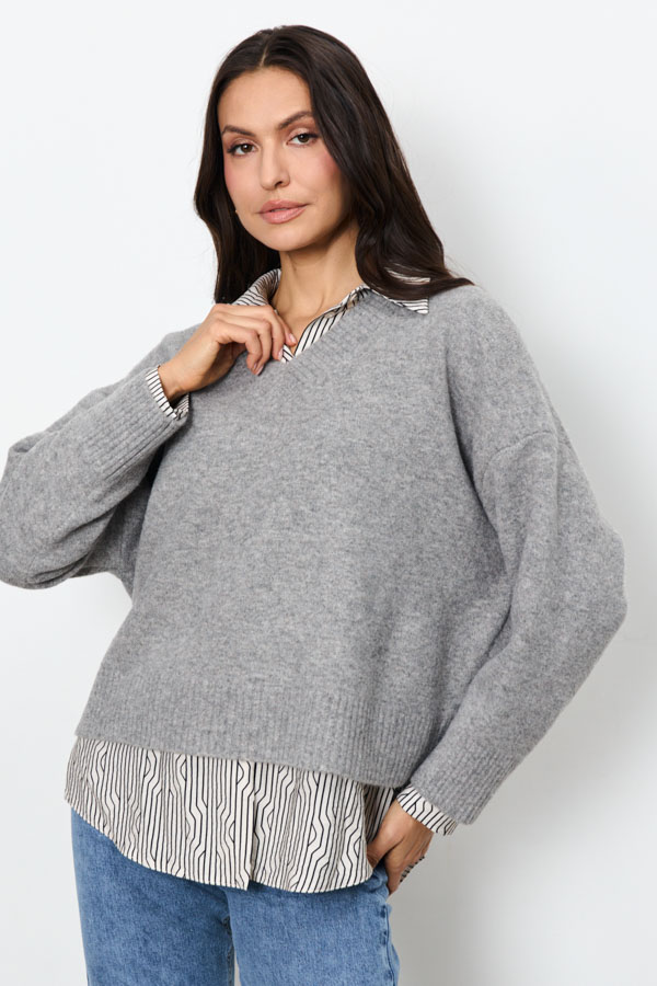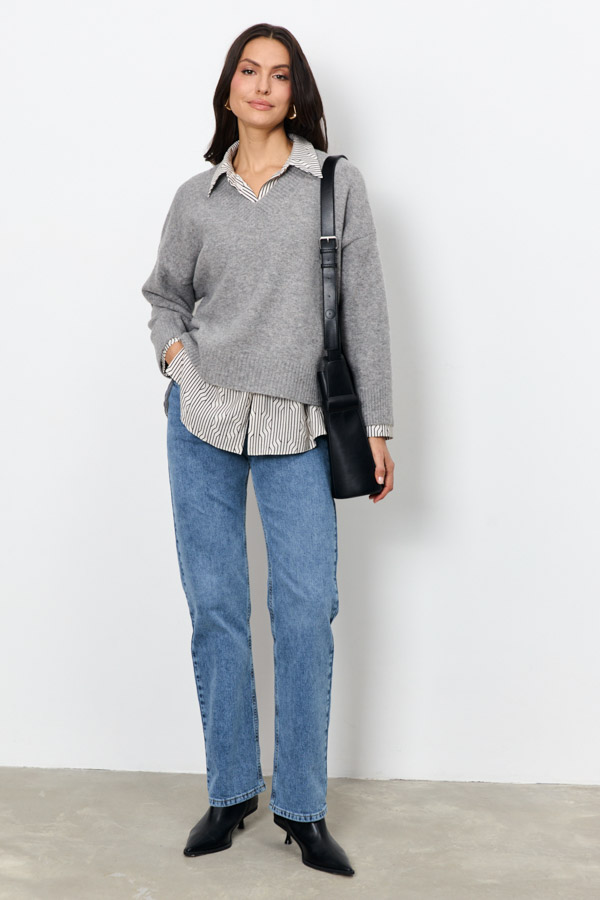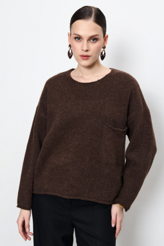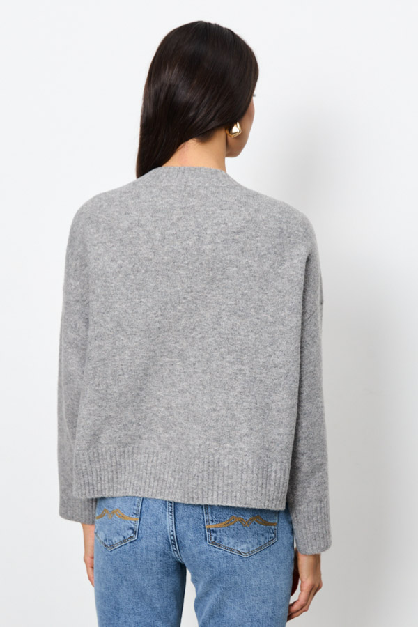 Этот джемпер – воплощение комфорта и стиля. Его свободный силуэт и спущенная линия плеча создают расслабленный, но элегантный образ. V-образный вырез горловины, низ изделия и низ рукавов оформлены резинкой. Изделие выполнено из меланжевой пряжи.