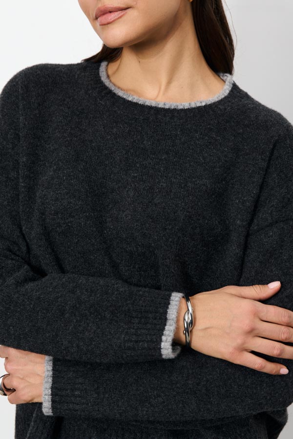 Этот джемпер – воплощение комфорта и стиля. Его свободный силуэт и спущенная линия плеча создают расслабленный, но элегантный образ. Круглый вырез горловины, низ изделия и низ рукава оформлены резинкой. Изделие выполнено из мягкой пряжи