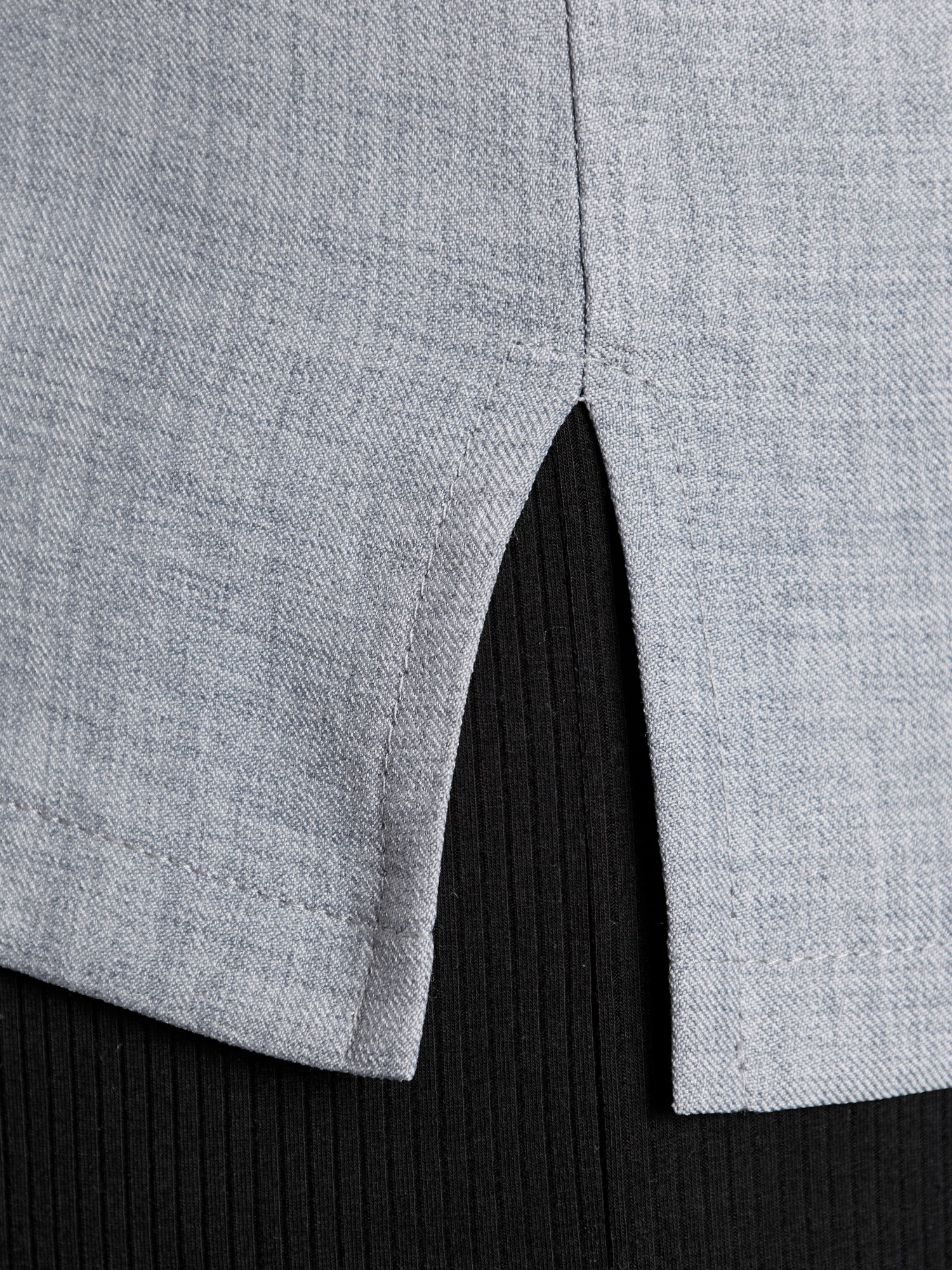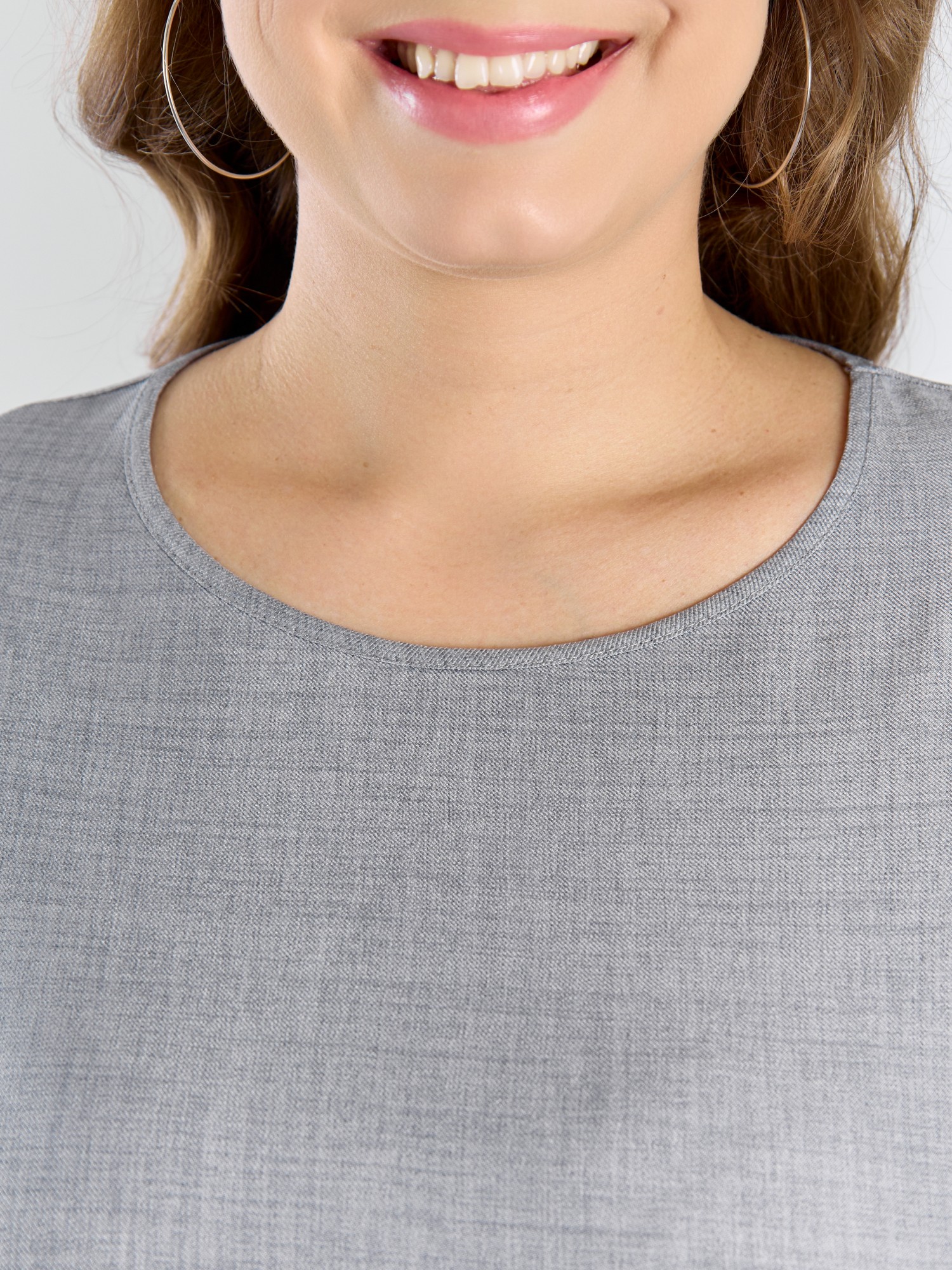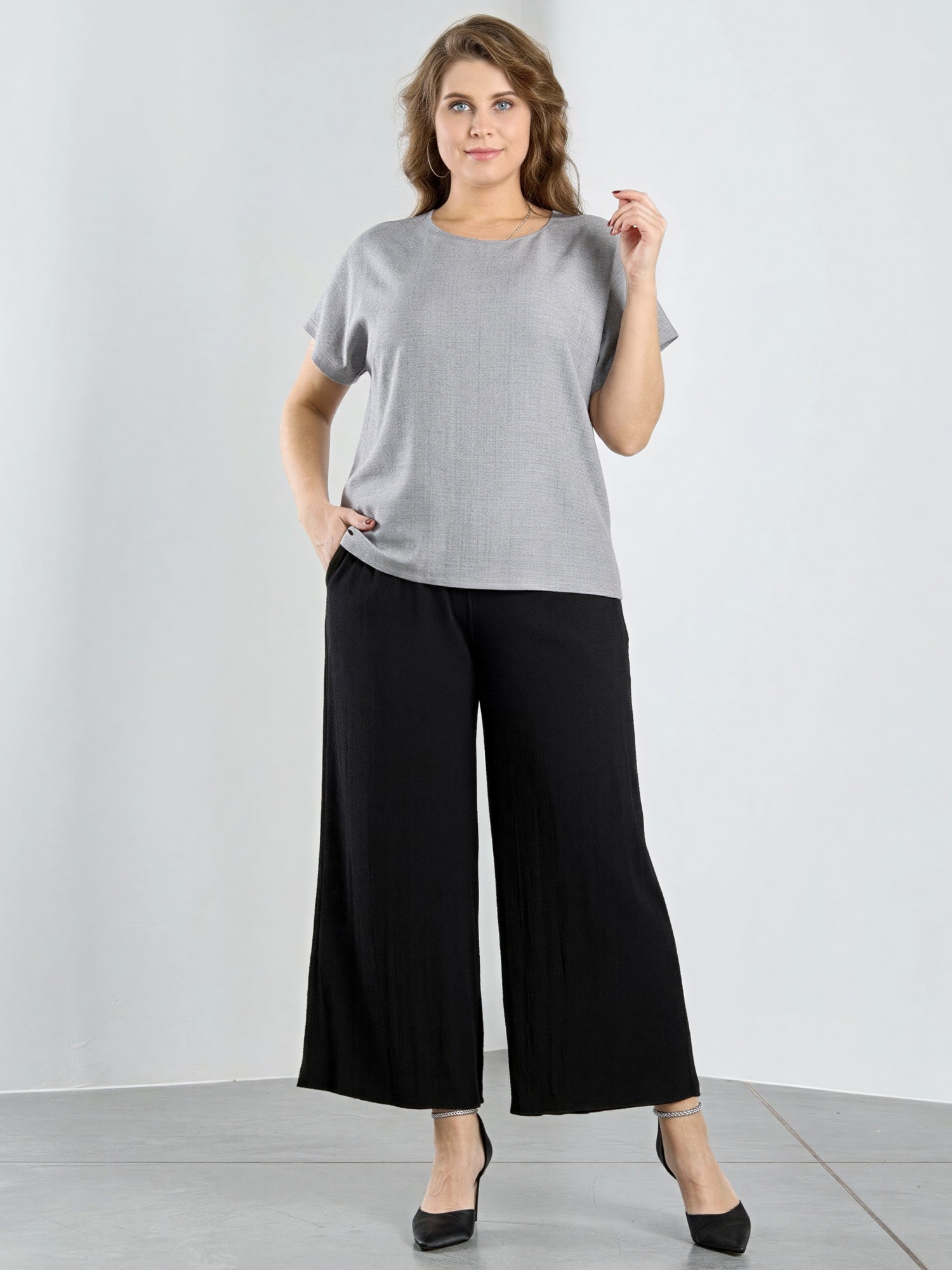 Блуза женская из гладкокрашеного тканого полотна, прямого силуэта, с горловиной овальной формы и цельнокроеными рукавами. Горловина окантована основным материалом, в боковых швах небольшие разрезы.