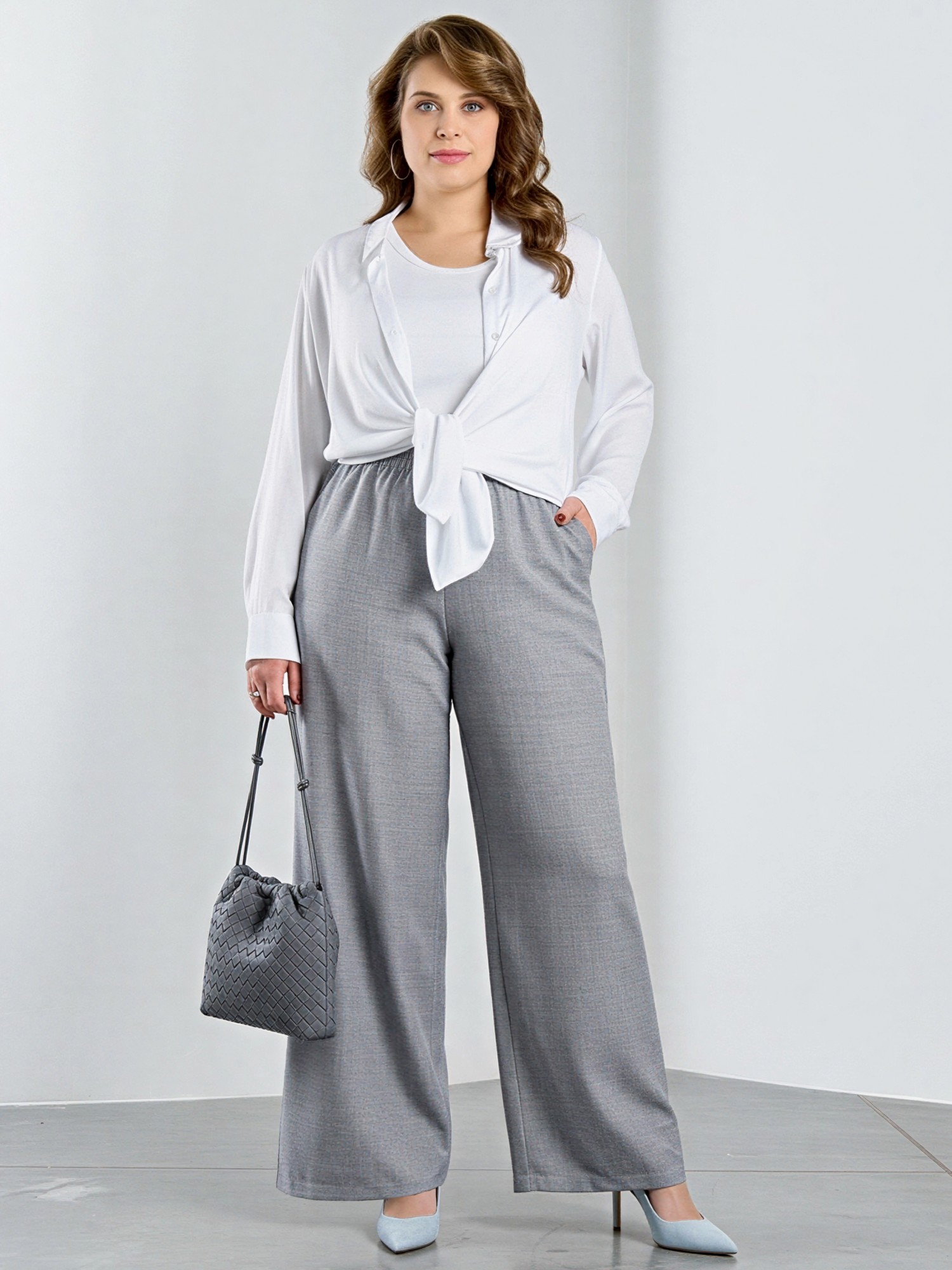 Брюки женские из гладкокрашеного тканого полотна, свободного покроя, с карманами в боковых швах, на притачном поясе с эластичной тесьмой внутри.