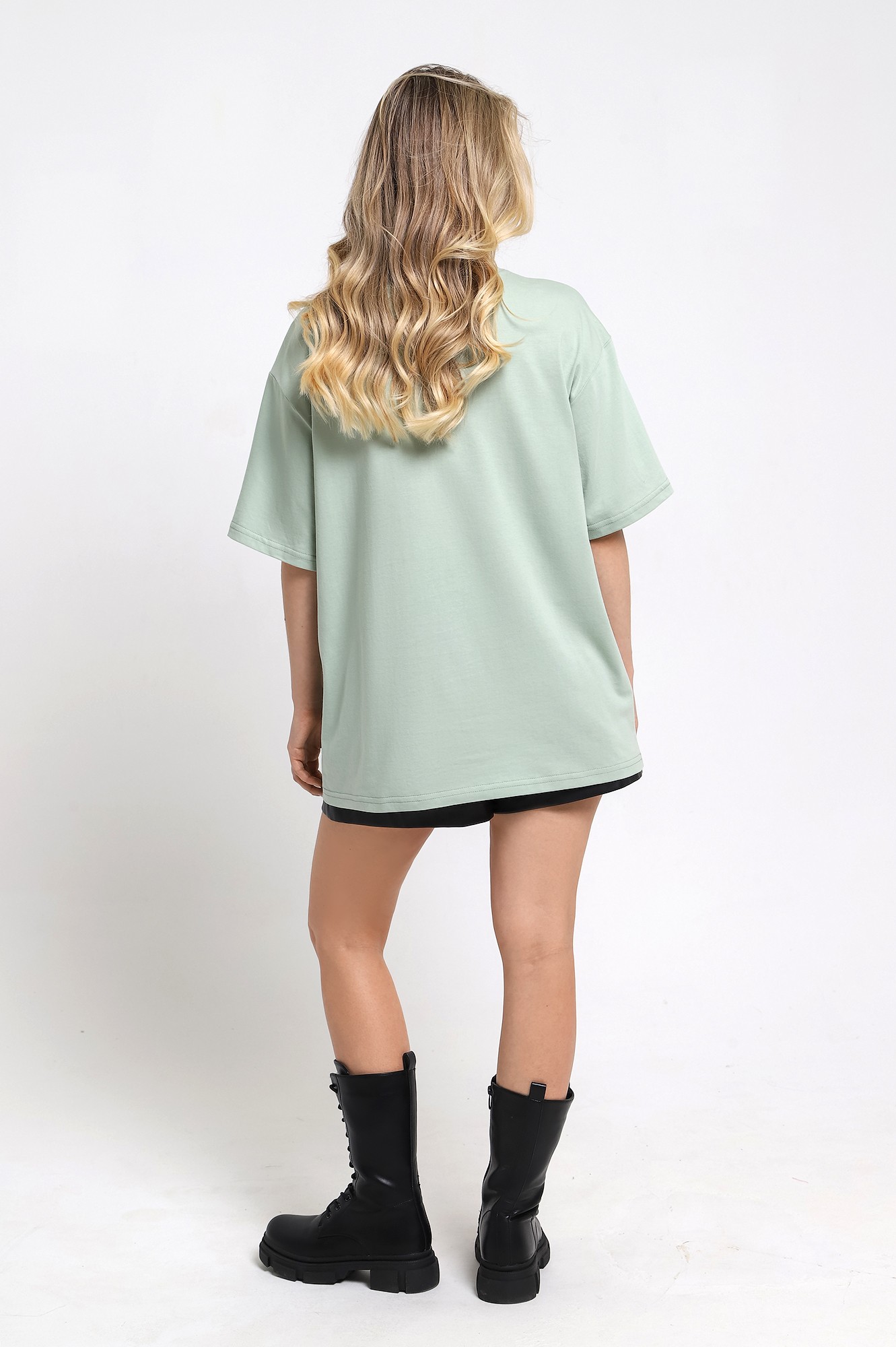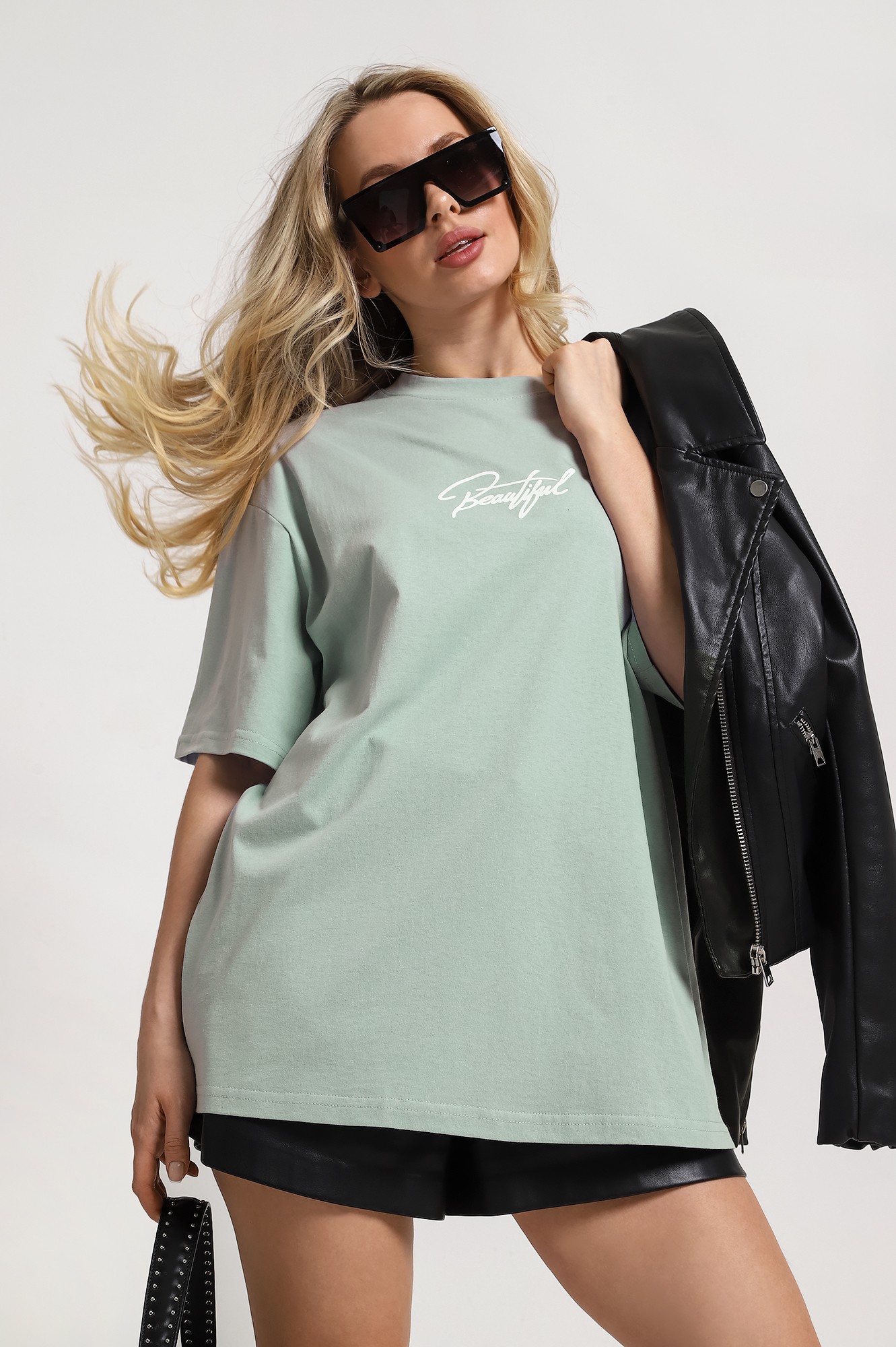 Футболка молодежная из гладкокрашенного полотна «кулирка» свободного покроя, со спущенной линией плеча, широкой подгибкой низа изделия и рукавов, горловиной овальной формы, обработанной втачной планкой, принтом на полочке, выполненным в технике «шелкографии».