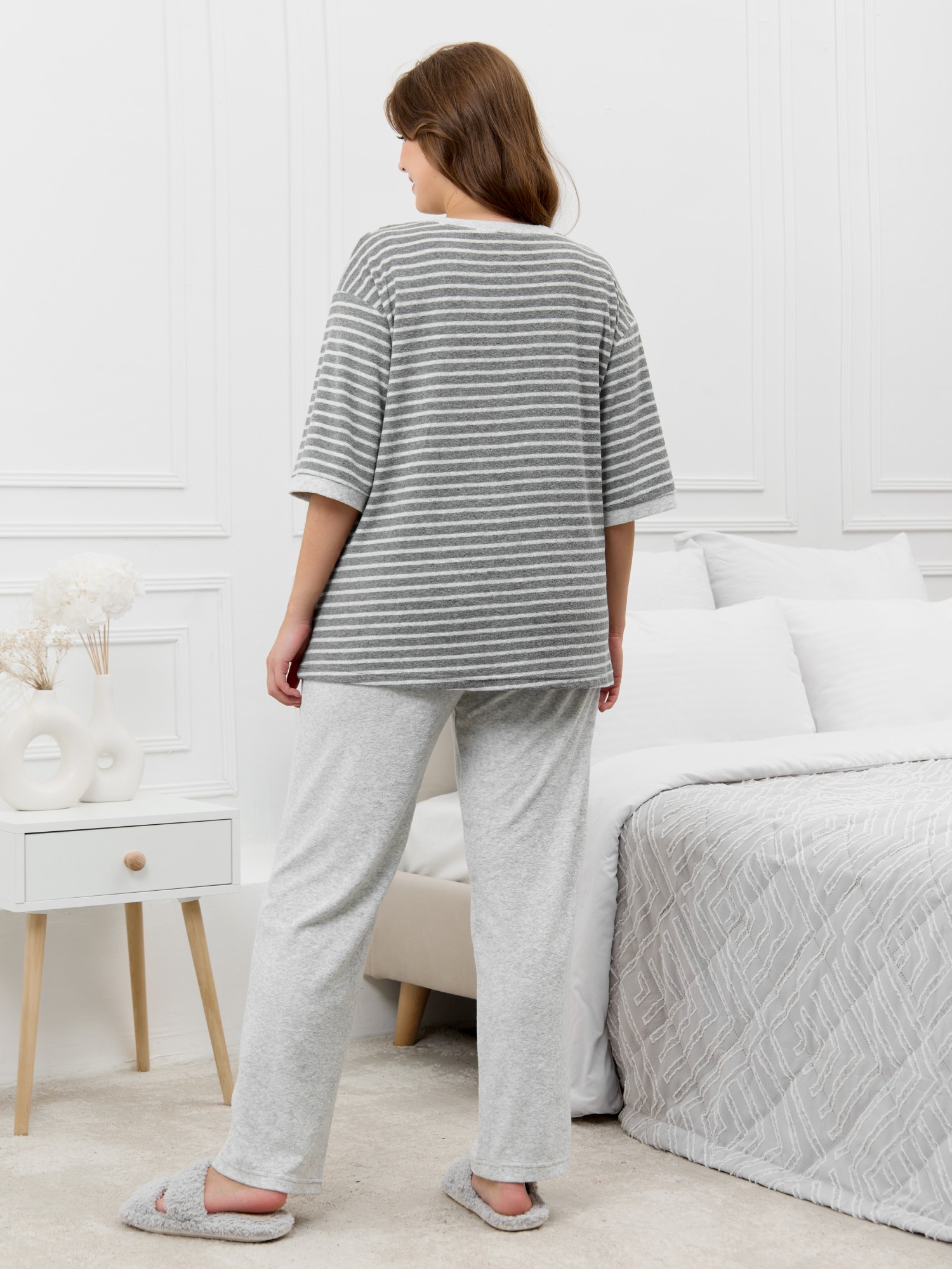 Костюм женский из трикотажного полотна «махра» в комбинации двух видов в единой цветовой гамме, состоящий из футболки и брюк. Футболка – из полотна в « полоску», с втачными короткими рукавами, горловиной овальной формы, обработанной втачной планкой и вышивкой по центру переда. Планка горловины и манжеты на рукавах выполнены из контрастного полотна «махра меланж».Брюки – из полотна «махра меланж» классического покроя, с карманами в боковых швах, на притачном поясе с эластичной тесьмой внутри.