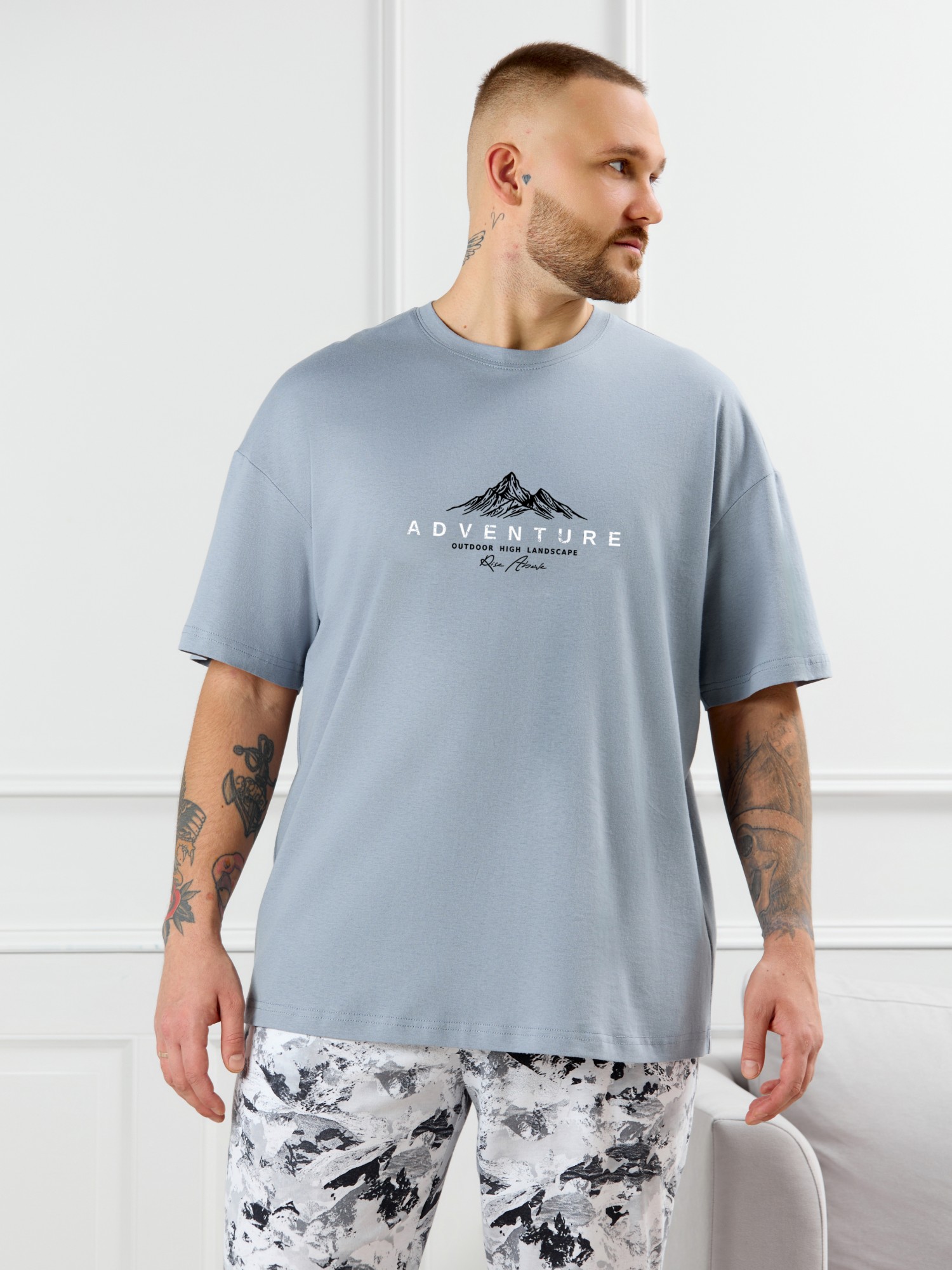 Костюм мужской, состоящий из футболки и брюк. Футболка однотонная с принтом на груди; модель свободная, со спущенной линией плеч, овальным вырезом горловины. Брюки из полотна с набивным рисунком эксклюзивного дизайна, прямые, с боковыми карманами с обтачными входами, на притачном поясе с отстроченной эластичной тесьмой.