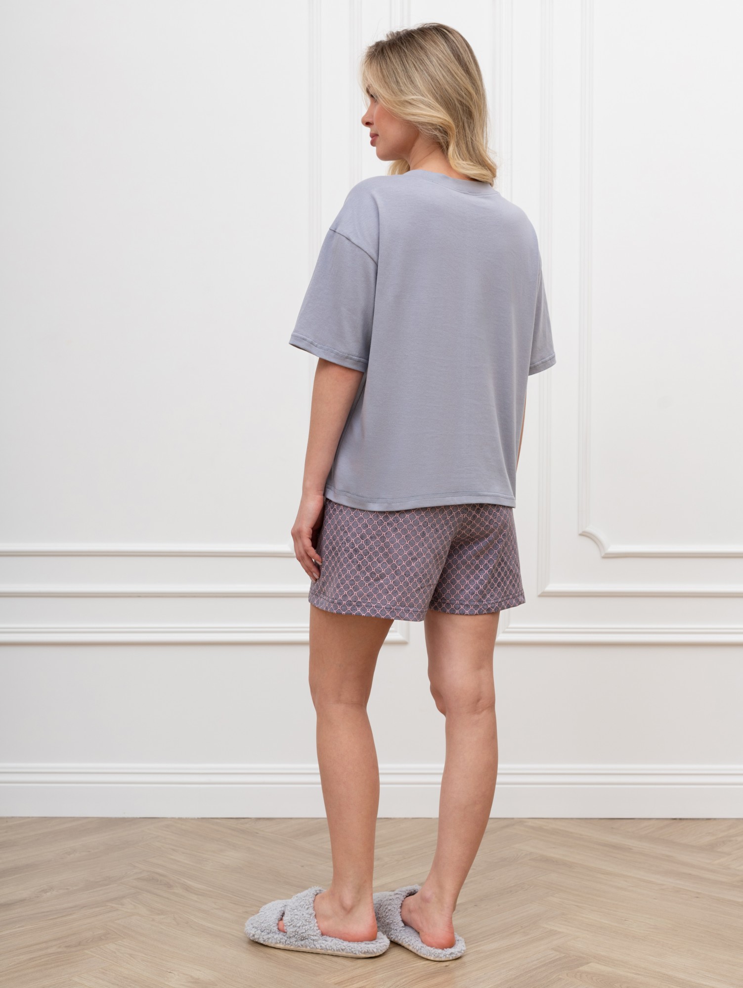 Костюм женский из трикотажного полотна «кулирка» в комбинации двух видов: с набивным рисунком и гладкокрашенного в единой цветовой гамме, состоящий из футболки и шорт.Футболка - из гладкокрашеного полотна, классического покроя, с короткими втачными рукавами, горловиной V- образной формы и принтом на полочке, выполненным в технике «шелкографии». Горловина обработана втачной планкой из основного материала.Шорты - из полотна с набивным рисунком, свободного покроя, укороченные, с карманами в боковых швах, на притачном поясе с эластичной тесьмой по талии и шнурком, продетым в две обметанные петли.