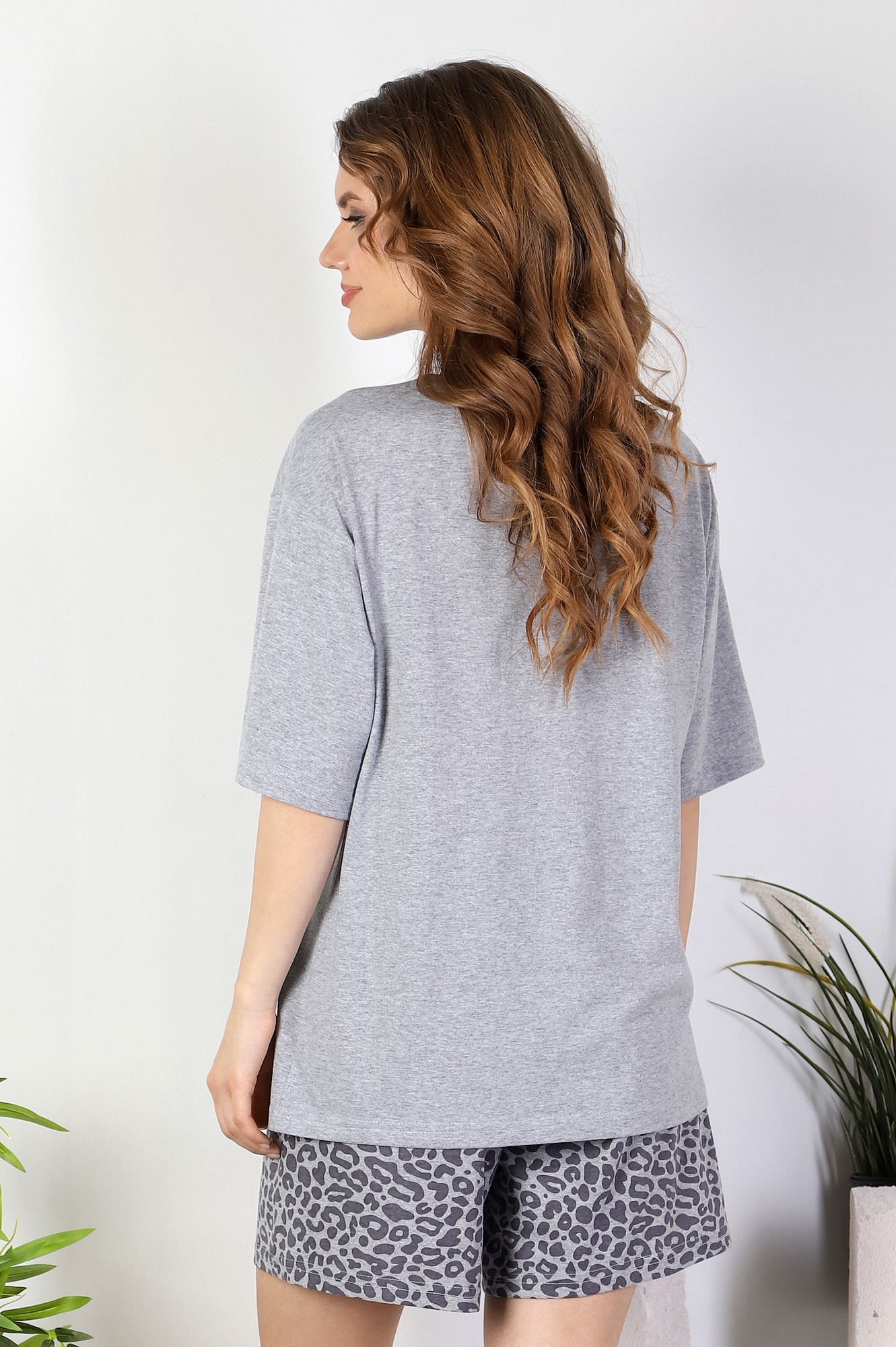 Костюм женский из трикотажного полотна «кулирка» в комбинации двух видов: с набивным рисунком и гладкокрашеного в единой цветовой гамме, состоящий из футболки и шорт. Футболка - из гладкокрашеного полотна, классического покроя, с короткими втачными рукавами, горловиной овальной формы, обработанной окантовкой из основного материала и принтом на полочке, выполненным в технике «шелкографии». Шорты – из полотна с набивным рисунком, свободные, с карманами в боковых швах, на притачном поясе с эластичной тесьмой внутри.