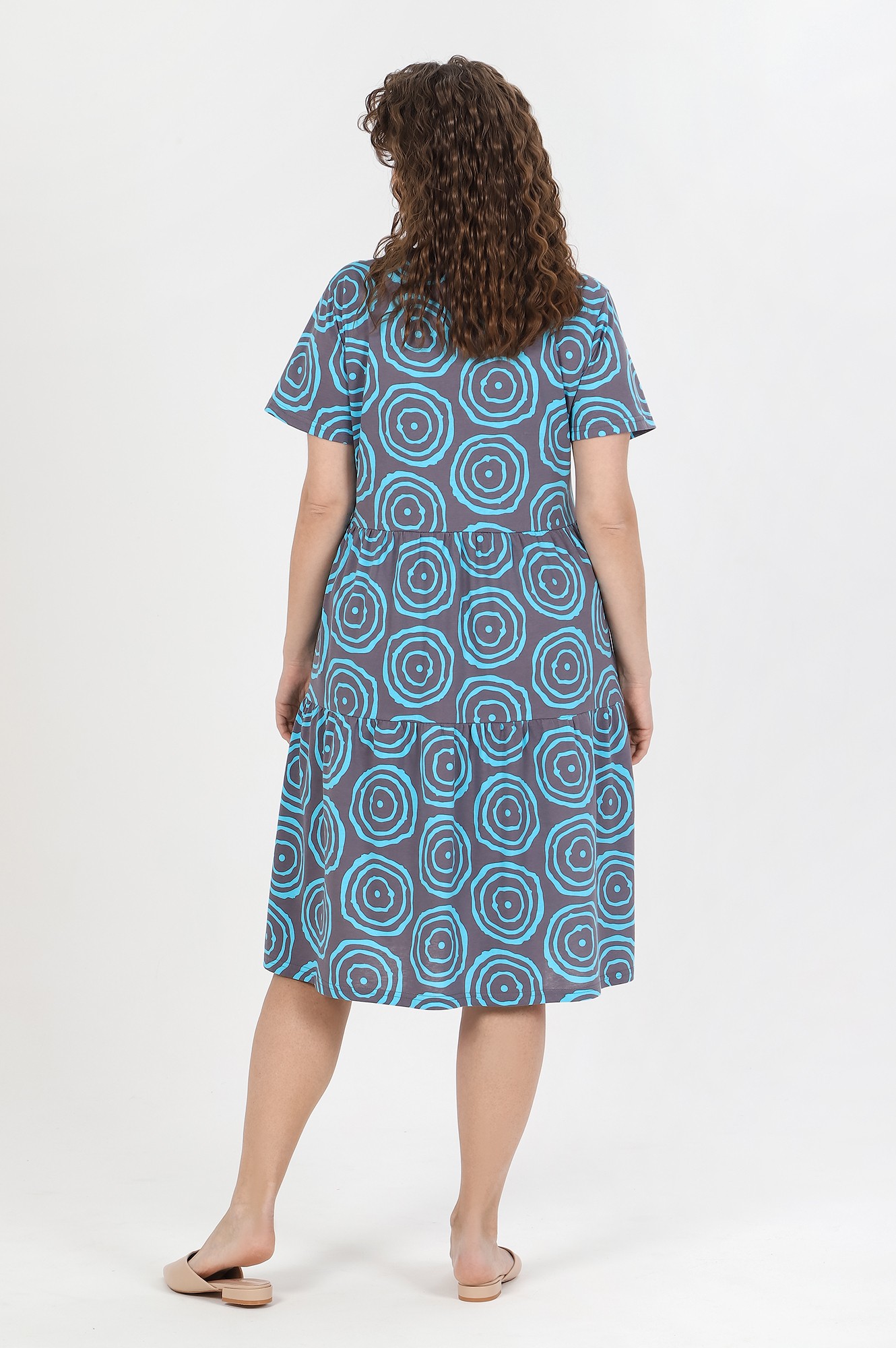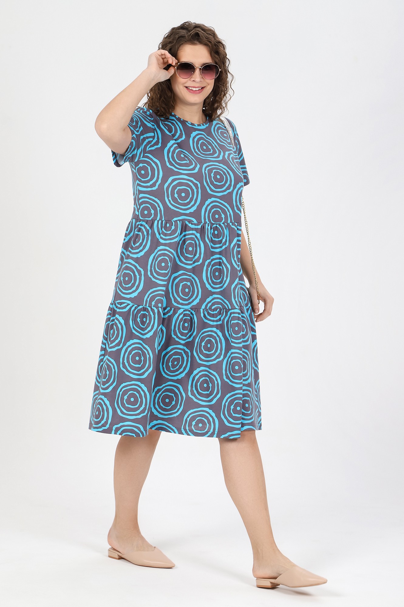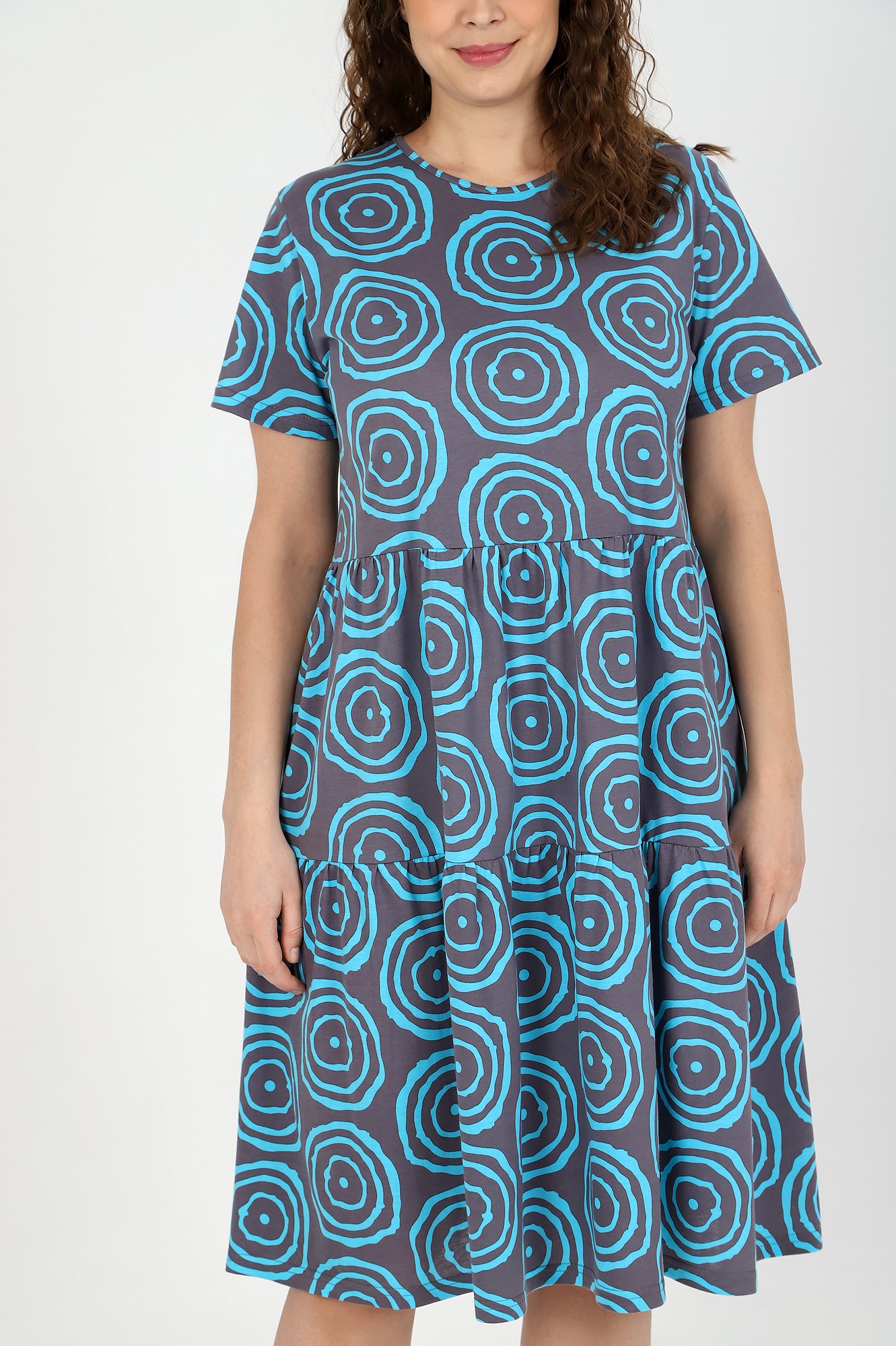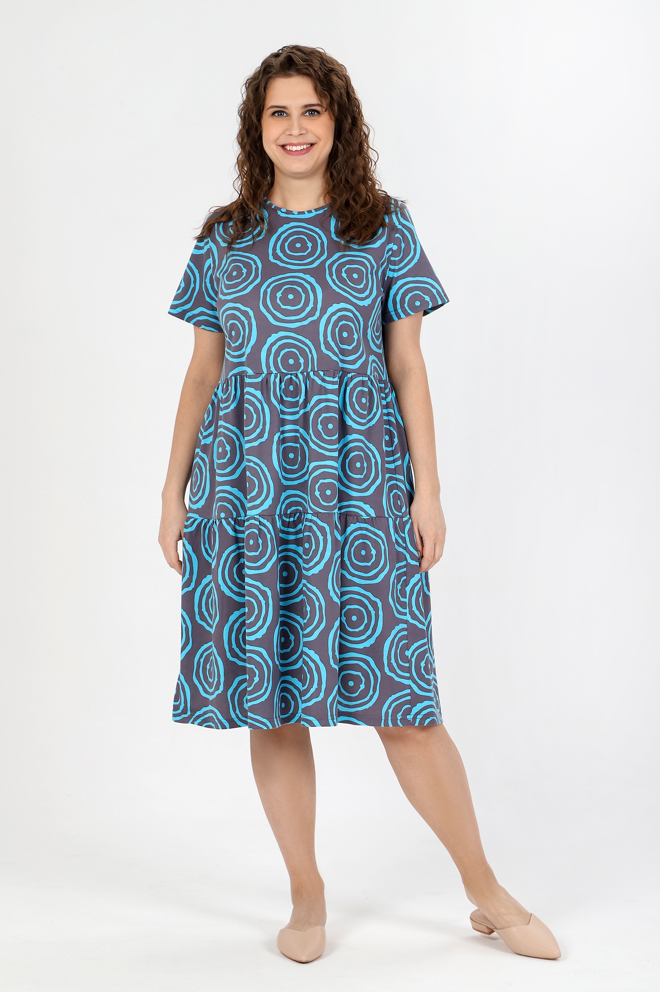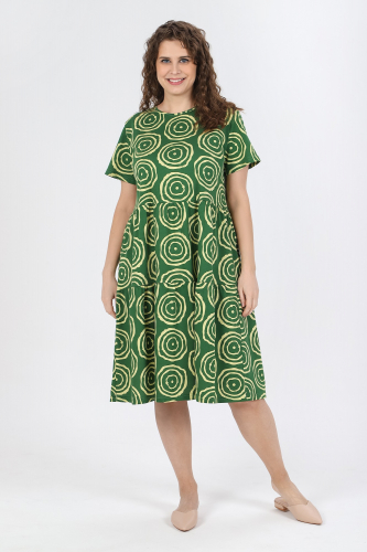 Платье женское из трикотажного полотна «кулирка» с набивным рисунком, свободного покроя, отрезное по линии талии, с короткими втачными рукавами и горловиной овальной формы, обработанной окантовкой из основного материала. Юбка – из двух ярусов, каждый из которых присборен по шву соединения с верхней деталью.