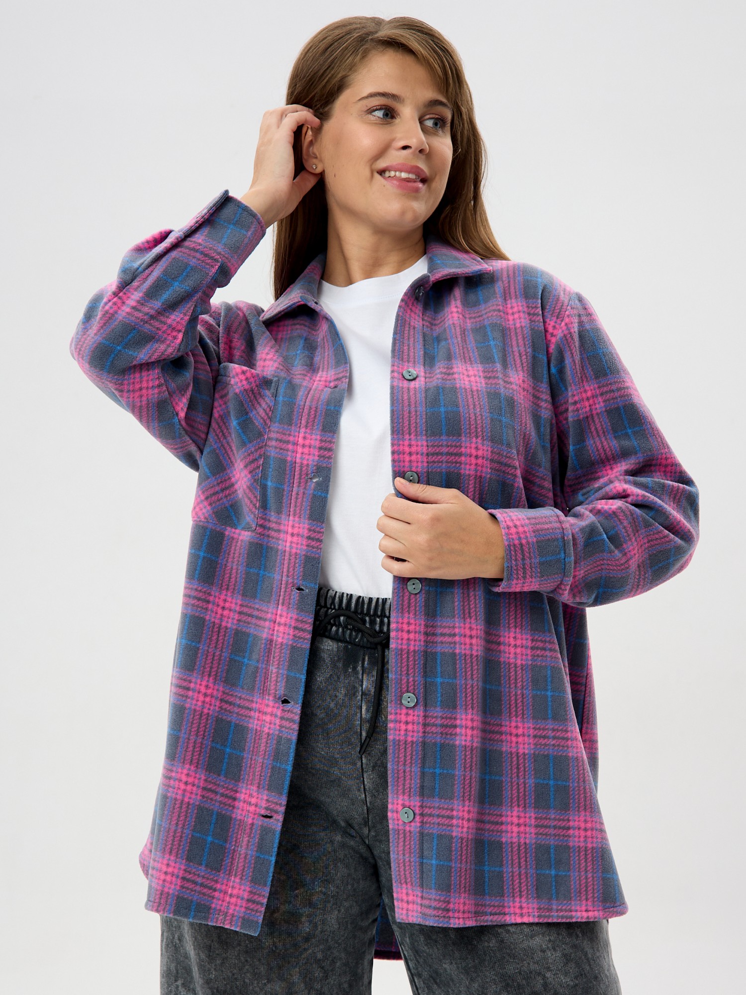 Рубашка (туника) женская из трикотажного полотна «флис» с набивным рисунком «клетка», свободного силуэта, с длинными втачными рукавами напритачных манжетах, стояче-отложным воротником, нагрудным карманом,фигурным низом и центральной бортовой застежкой на петли и пуговицы. Спинка – с отрезной кокеткой и бантовой складкой в центре соединительного шва.