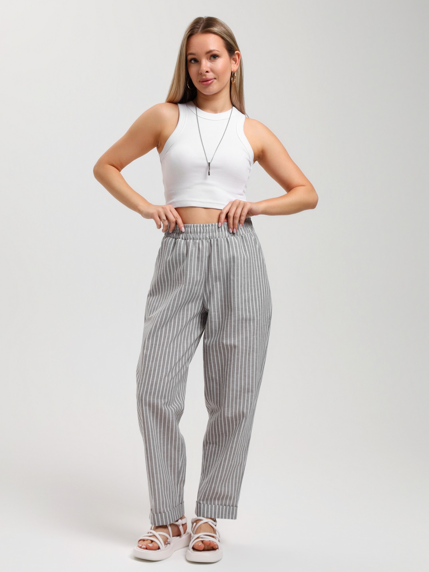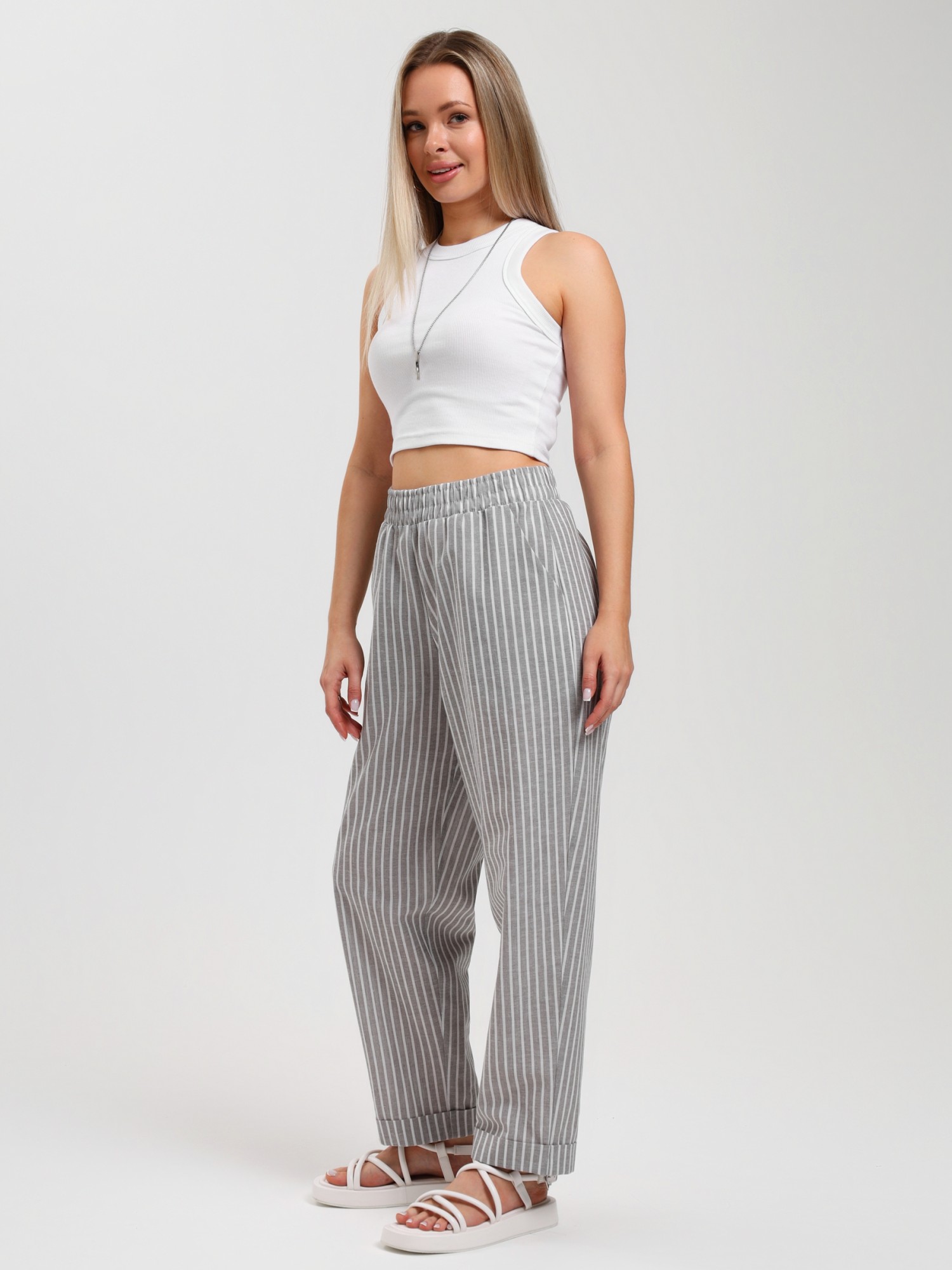 Брюки молодежные из тканого полотна с набивным рисунком в полоску, свободного покроя, с карманами в боковых швах, на притачном поясе с эластичной тесьмой внутри.