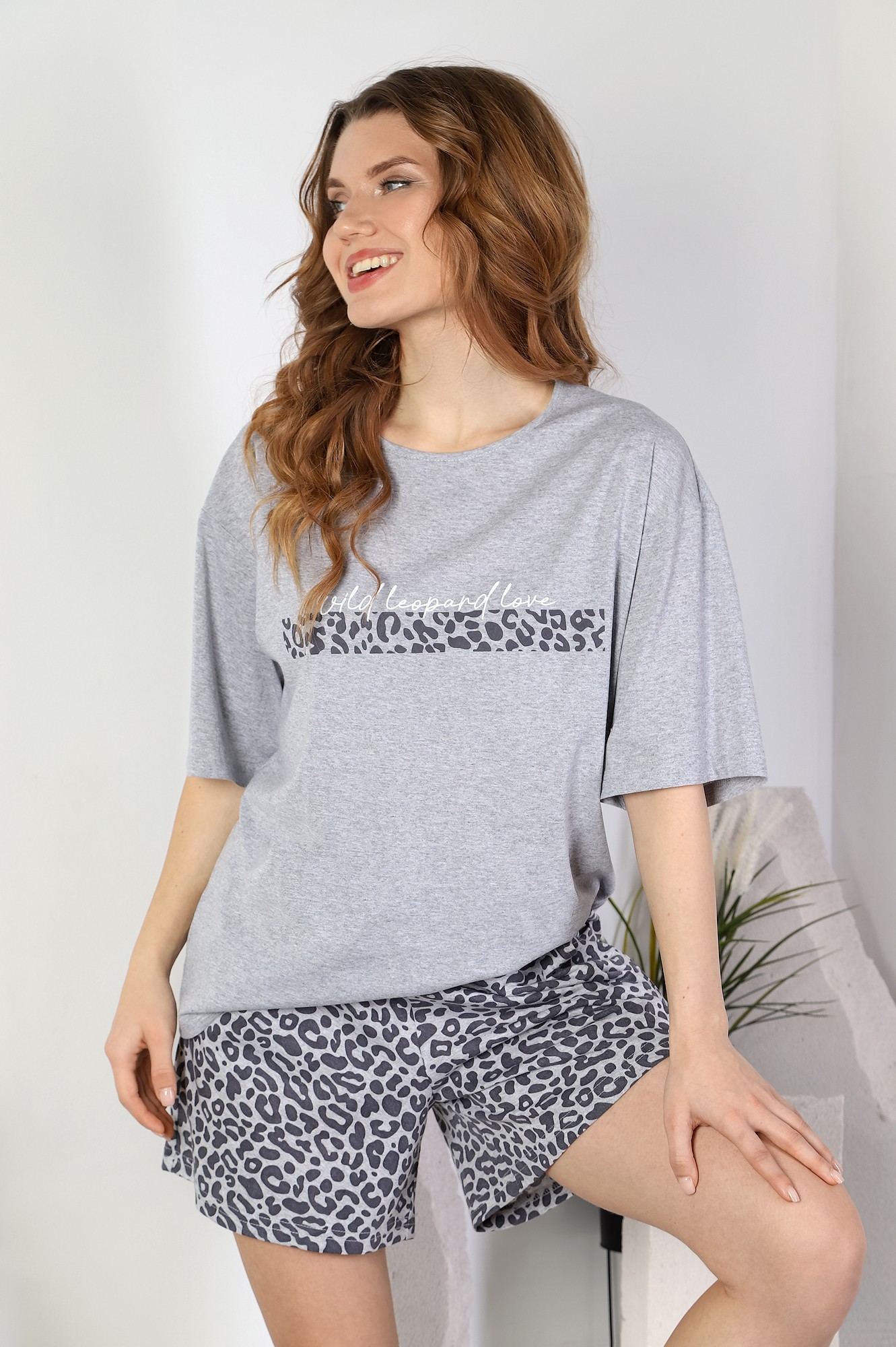 Костюм женский из трикотажного полотна «кулирка» в комбинации двух видов: с набивным рисунком и гладкокрашеного в единой цветовой гамме, состоящий из футболки и шорт. Футболка - из гладкокрашеного полотна, классического покроя, с короткими втачными рукавами, горловиной овальной формы, обработанной окантовкой из основного материала и принтом на полочке, выполненным в технике «шелкографии». Шорты – из полотна с набивным рисунком, свободные, с карманами в боковых швах, на притачном поясе с эластичной тесьмой внутри.