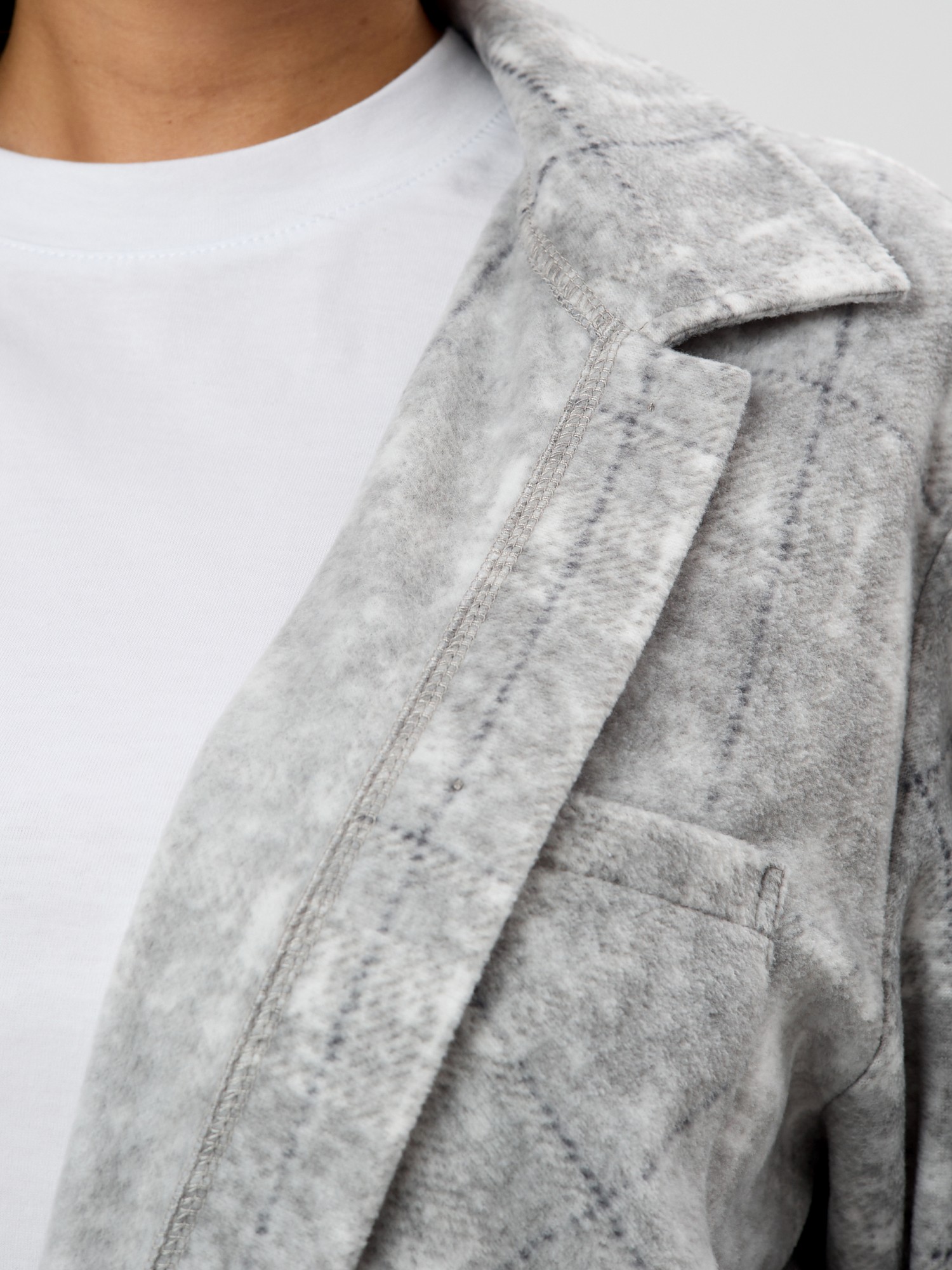 Рубашка (туника) молодежная из трикотажного полотна «флис» с эффектом «варенки», полуприлегающего силуэта, с длинными втачными рукавами на притачных манжетах, стояче-отложным воротником, нагрудным карманом, фигурным низом и центральной бортовой застежкой на петли и пуговицы. Спинка – с отрезной кокеткой и бантовой складкой в центре соединительного шва.
