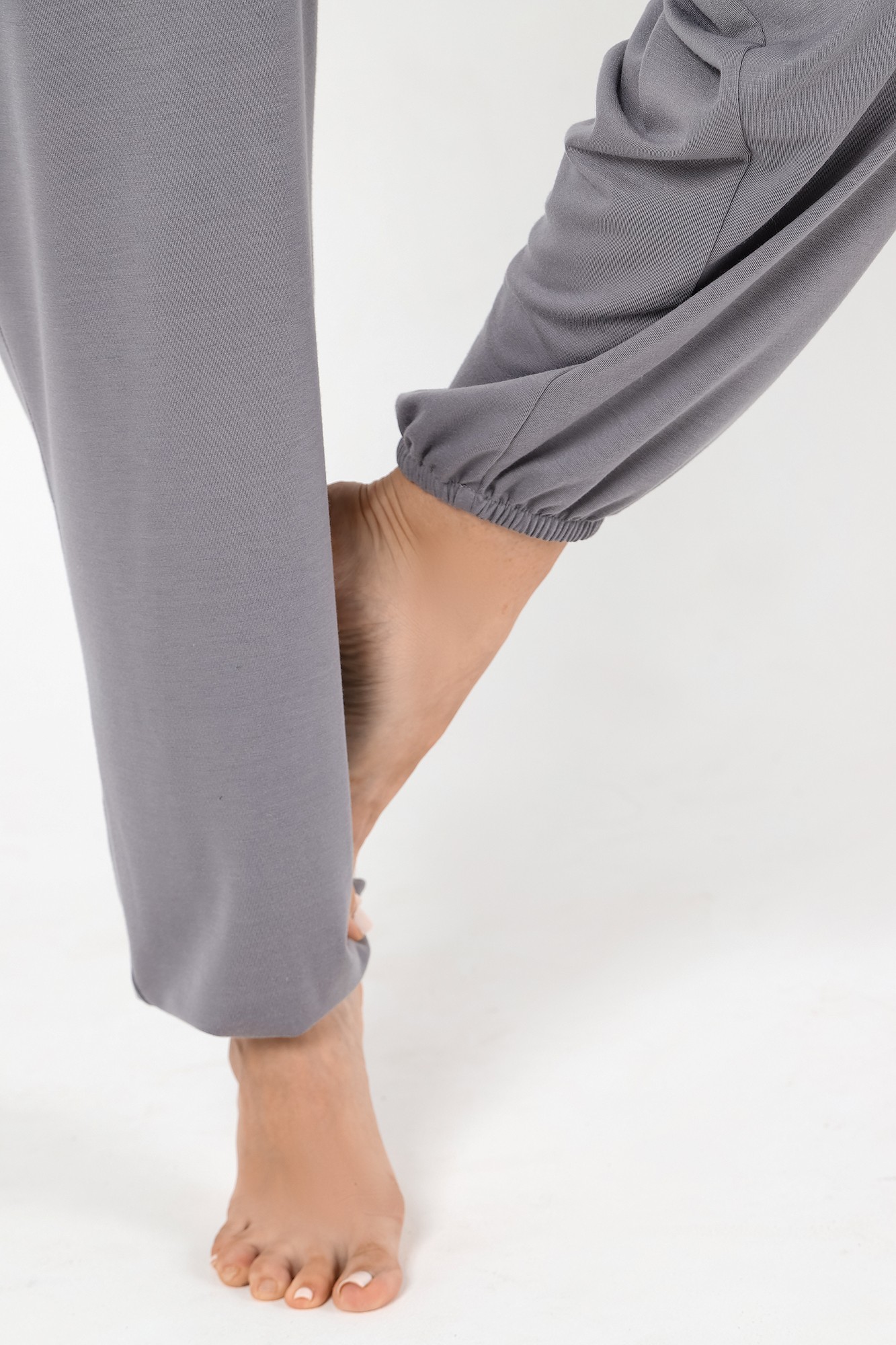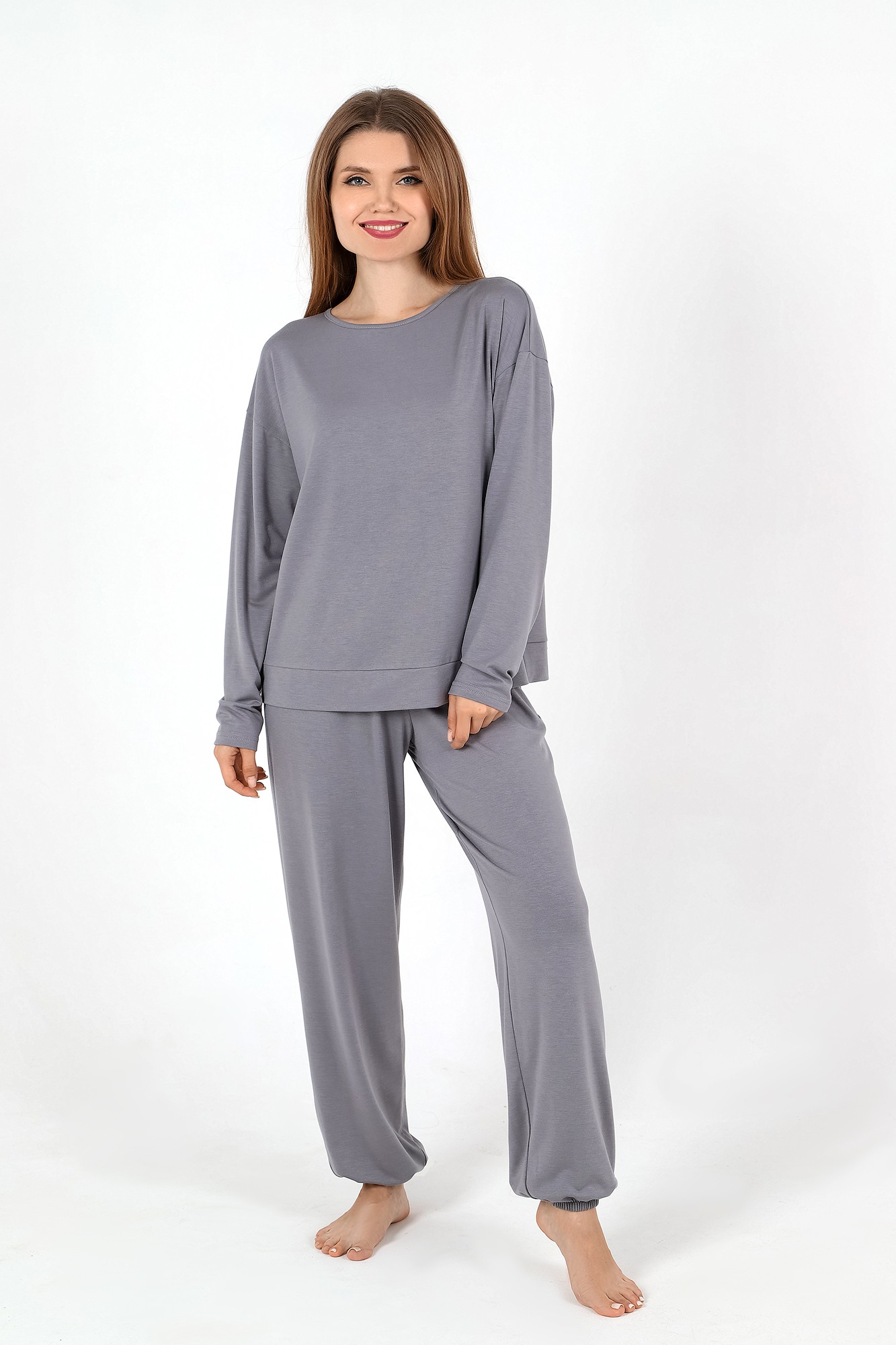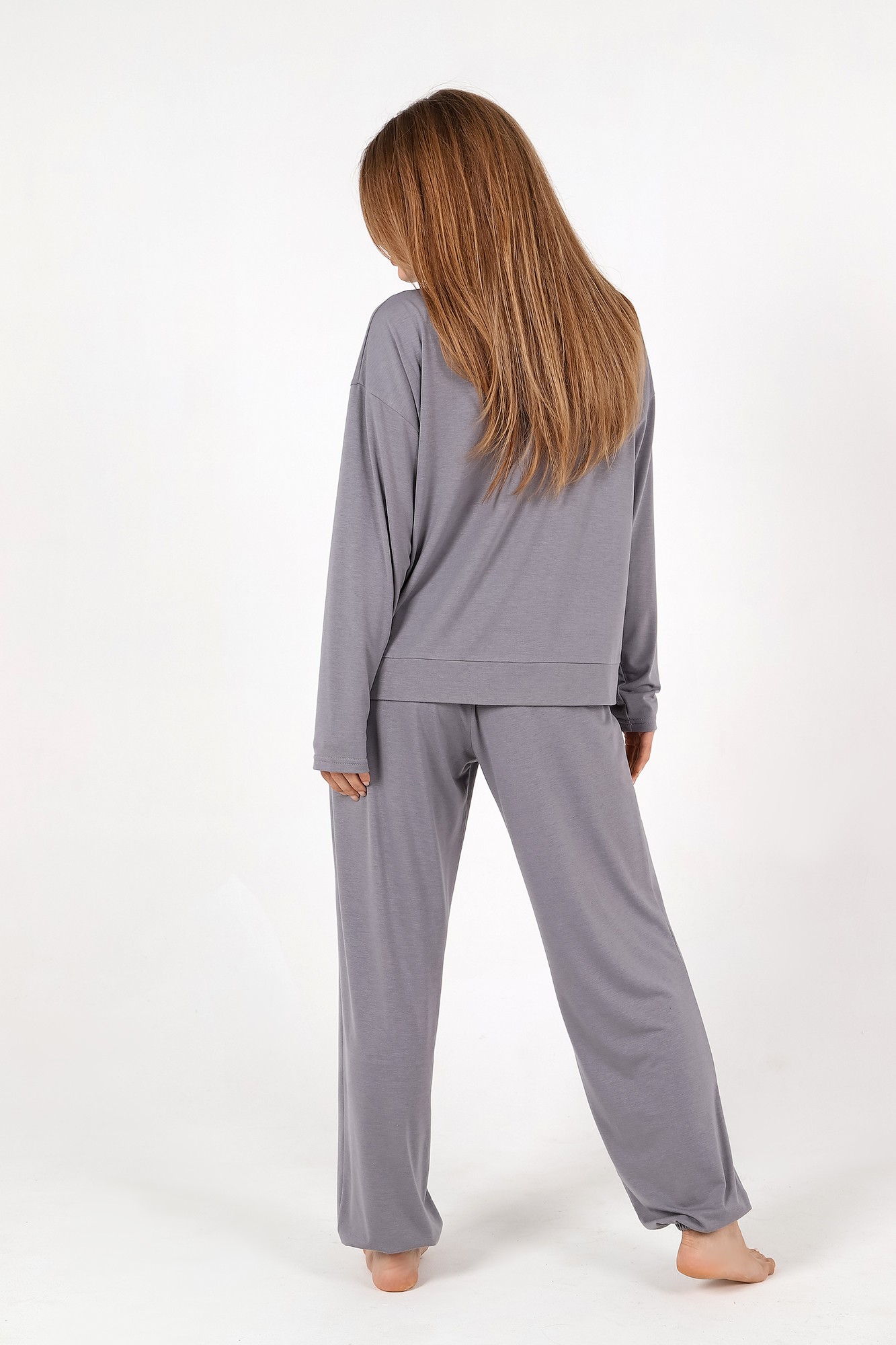 Пижама молодежная из гладкокрашеного трикотажного полотна «джерси», состоящая из лонгслива и брюк. Лонгслив - свободного покроя, с длинными втачными рукавами и горловиной овальной формы. Горловина окантована основным материалом, низ изделия с притачным поясом.Брюки – свободного покроя, с эластичной тесьмой по талии и нижним срезам.