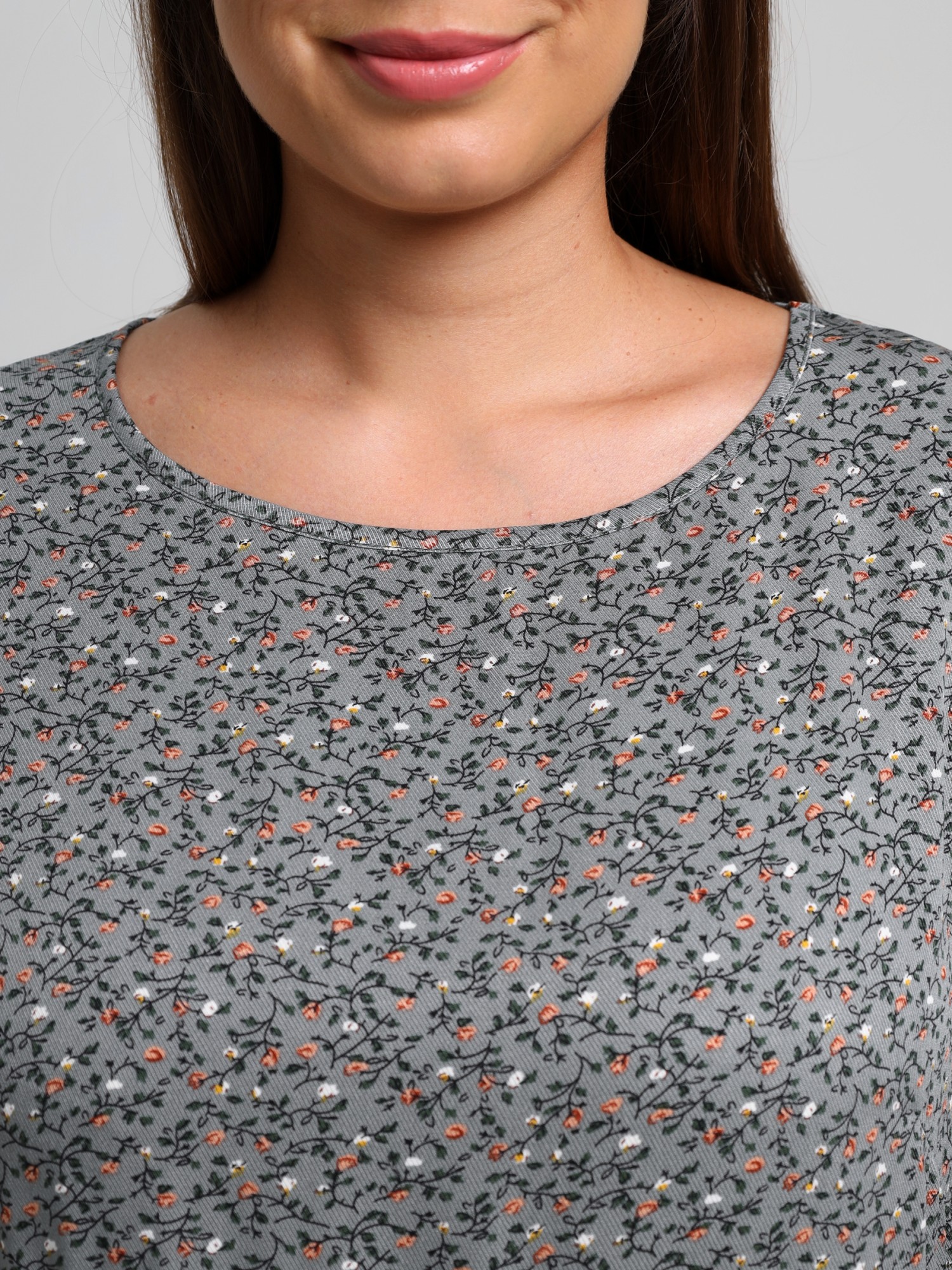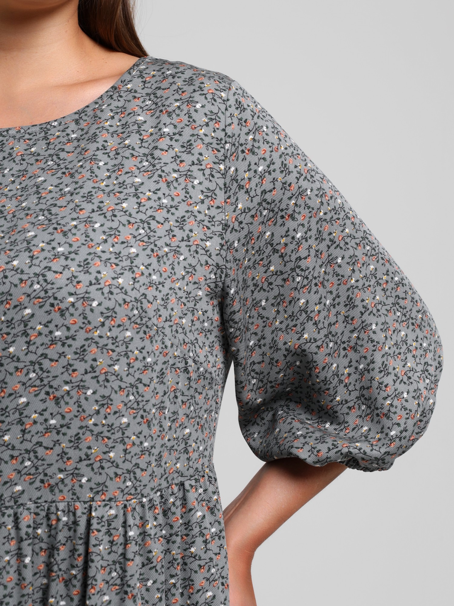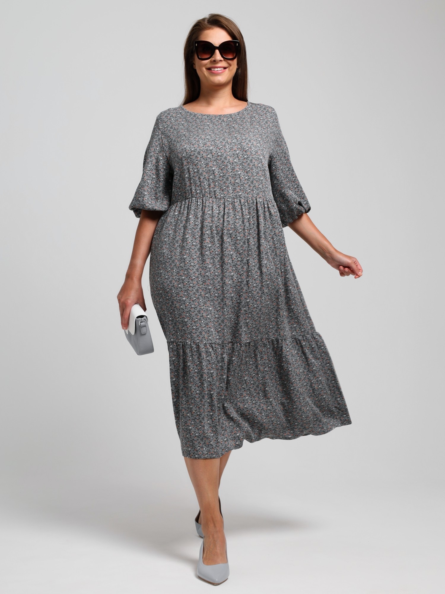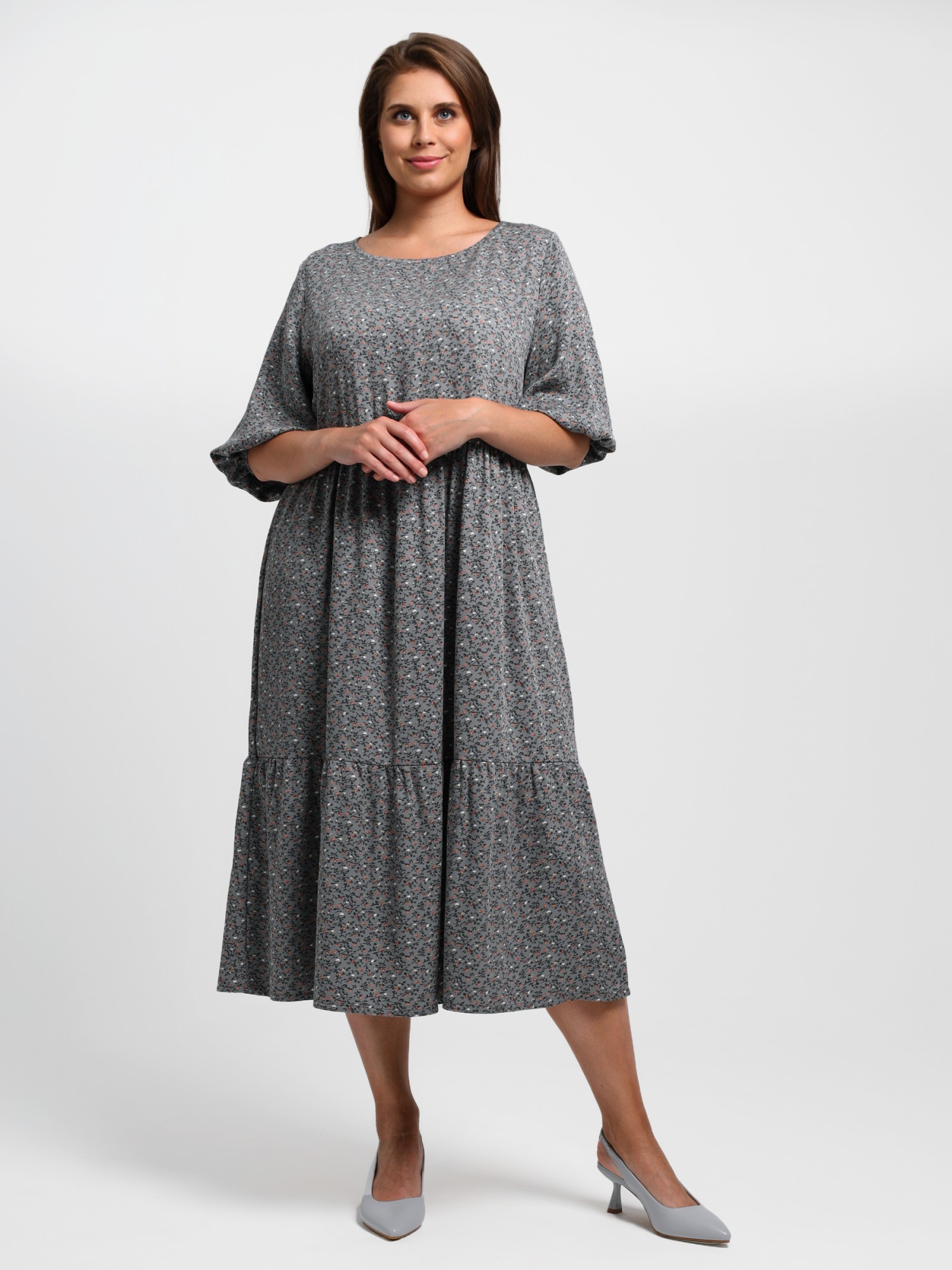 Платье женское из плательной ткани «твил» с набивным рисунком, свободного покроя, отрезное по линии талии, с втачными рукавами длиной 3/4 и горловиной овальной формы, окантованной основным материалом. Полочка – с вытачками в области груди. Юбка – из двух ярусов, каждый из которых присборен по шву соединения с верхней деталью.