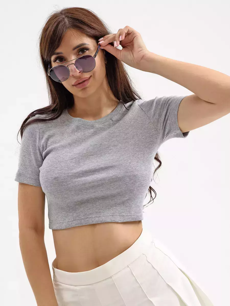 Футболка укороченная женская спортивного стиля, прилегающего силуэта- тренд сезона, выполнена из трикотажного х/б полотна с выработкой «рубчик» . Круглая горловина обработана бейкой из основного материала. Короткий втачной рукав.