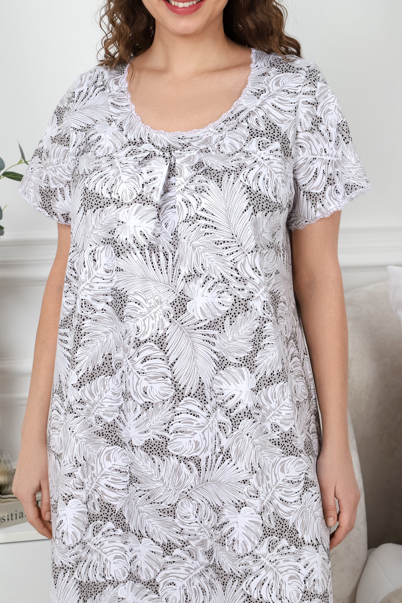 Сорочка женская из трикотажного полотна «кулирка» с набивным рисунком, свободного покроя, слегка расширенная книзу, с короткими втачными рукавами и горловиной овальной формы. Полочка – с отделочной деталью, повторяющей контур горловины, в шве притачивания которой симметрично относительно центра заложены 6 складочек-защипов. Наружный край горловины и низ рукавов обработаны узким кружевом.