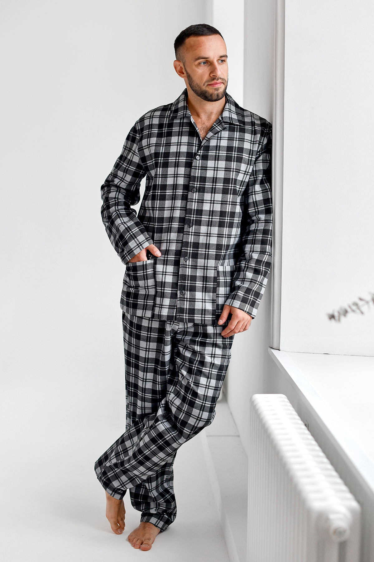 Мужская пижама прямого силуэта из хлопчатобумажной ткани – фланель. Это мягкий, приятный на ощупь материал, прекрасно подойдет для сна и  домашнего отдыха . Пижама  состоит из рубашки и брюк . Рубашка с длинными рукавами, накладными карманами , отложным воротником.  Брюки прямые с боковыми карманами.