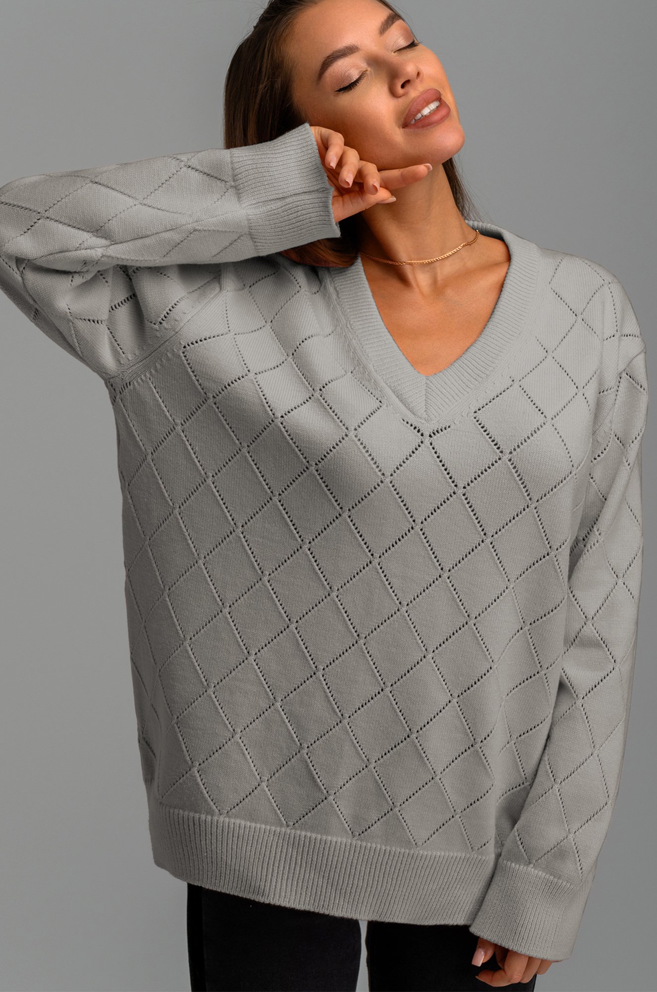 Откройте для себя уют и изысканность с женским джемпером светло-серого цвета. Ажурная вязка с ромбами и выразительный V-образный вырез делают этот свитшот идеальным выбором для тех, кто ценит простоту и комфорт в своем гардеробе.