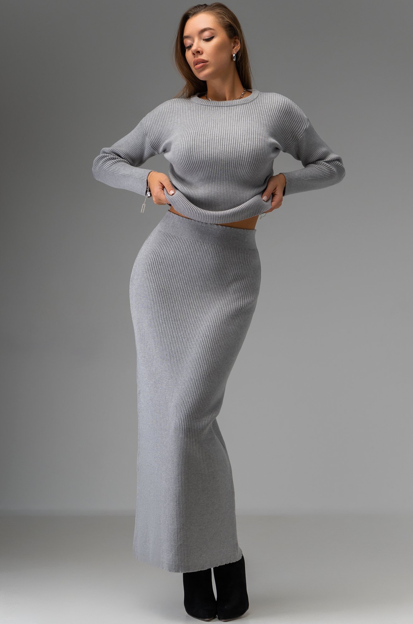 Женский костюм из мягкого вязаного трикотажа в рубчик — воплощение элегантности и уюта для прохладных дней. Джемпер прямого кроя с длинным рукавом и спущенным плечом дарит полную свободу движений, а круглая горловина добавляет образу классической сдержанности. Длинная юбка макси на мягкой резинке подчеркивает женственность и грациозность, создавая гармоничный силуэт.