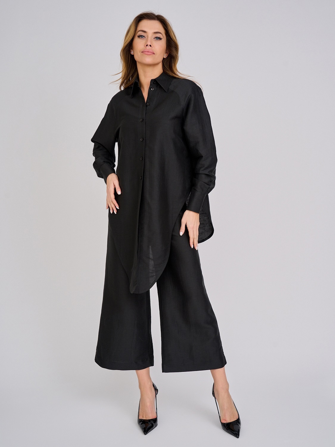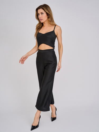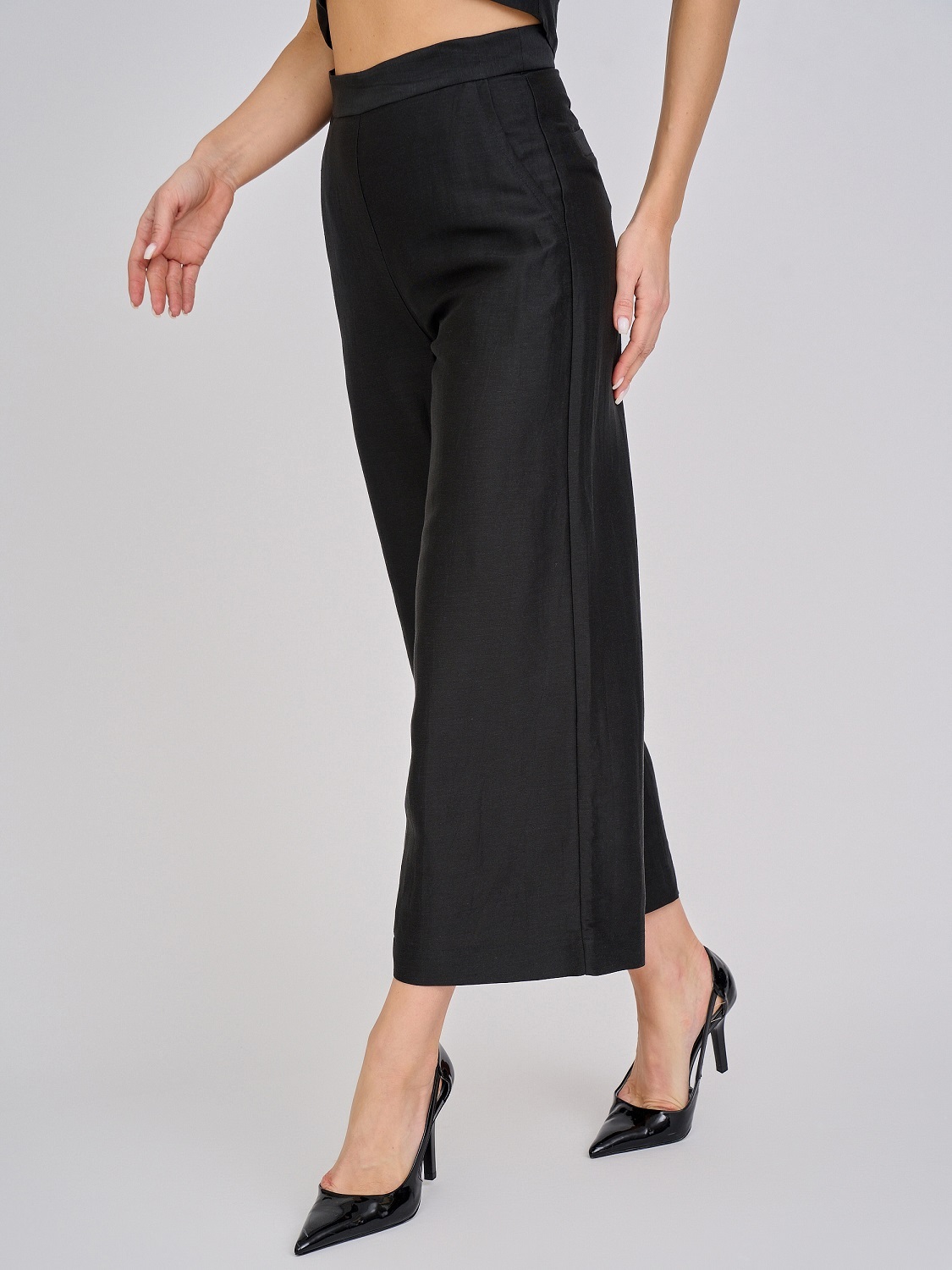 Элегантные кюлоты с высокой псадкой из тонкой льняной ткани. Длина изделия 7/8. Модель имеет карманы с косым входом по бокам и задние карманы, оформленные листочкой. Для создания полноценного тотал лука рекомендуем сочетать брюки с укороченным топом с подрезным лифом на тонких лямках SS 222.010149, так же можно сочетать со свободной блузой на запах SS 222.030043 или базовой однотоннной футболкой SS 222.030043 из коллекции Seven Senses для создания повседневного образа