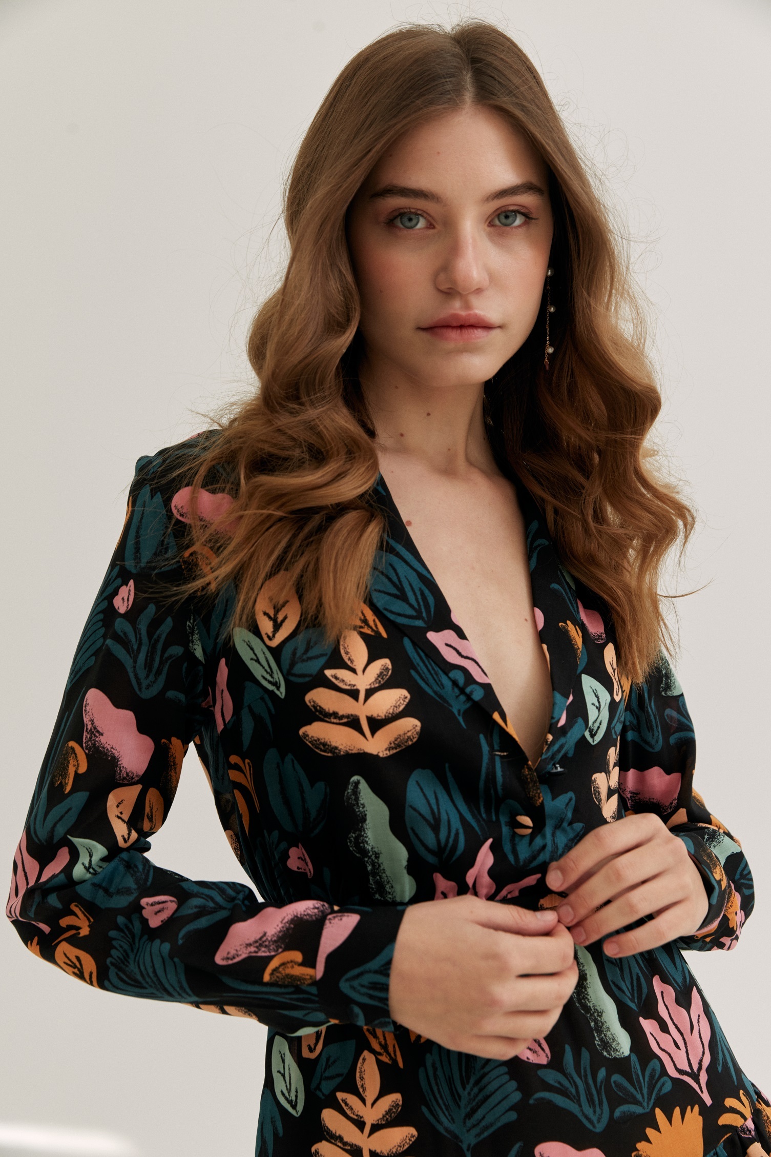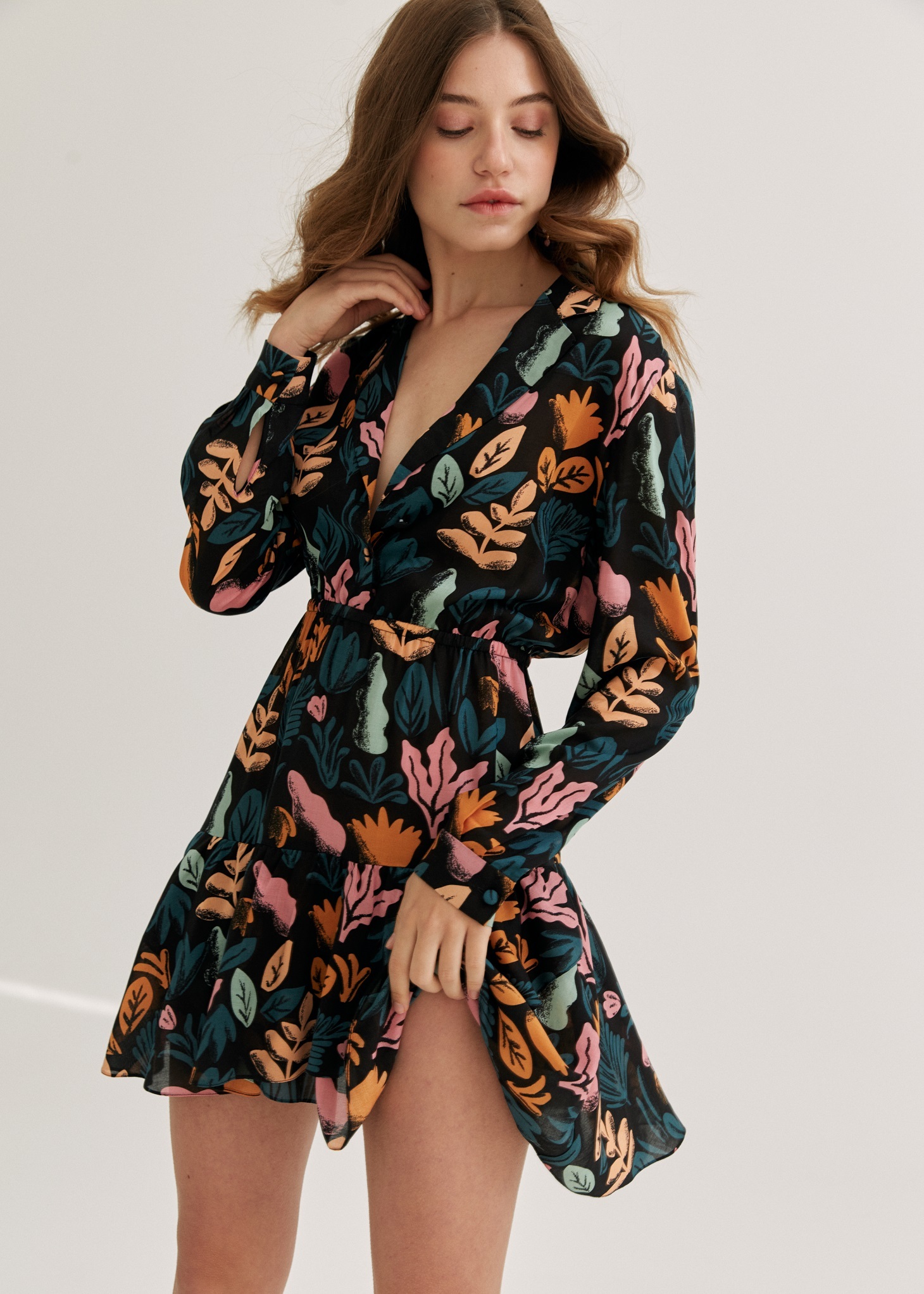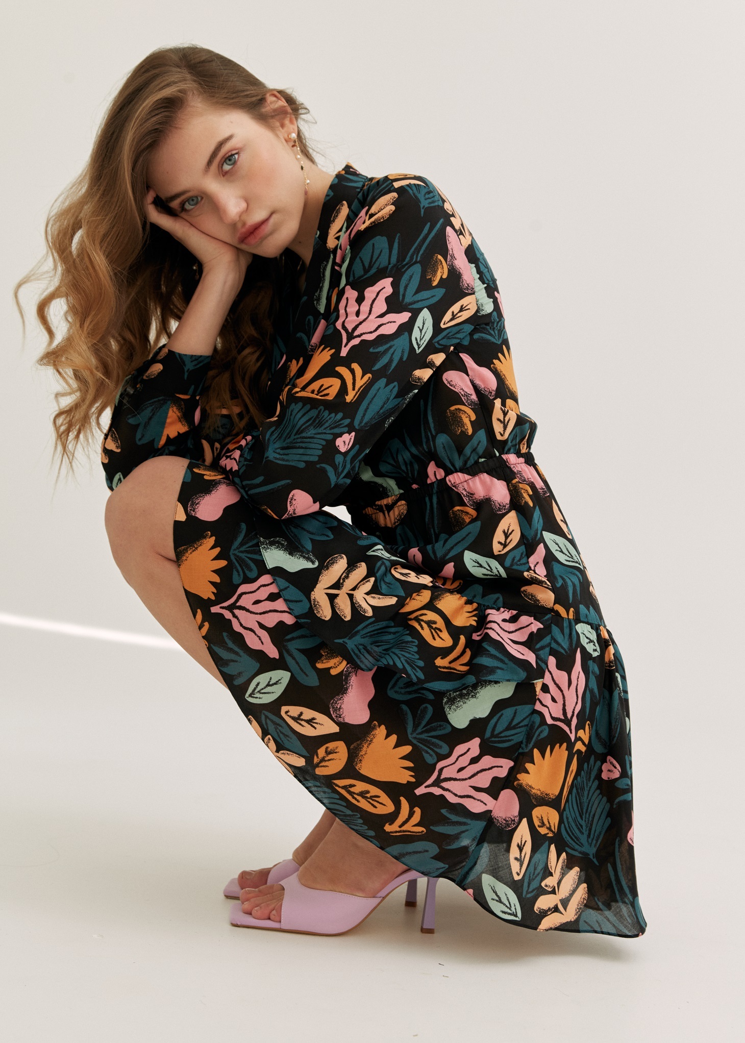 Платье из модала с цветочным дизайнерским принтом - украшение этого лета. Модель с V-образным вырезом, длинным спущенным рукавом и полуприлегающим силуэтом. Фиксируется на талии при помощи резинки. Платье украсит любой образ: от повседневного до официально-делогого
