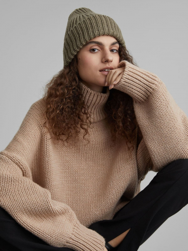 Шапка-бини крупной вязки, светлый хаки
