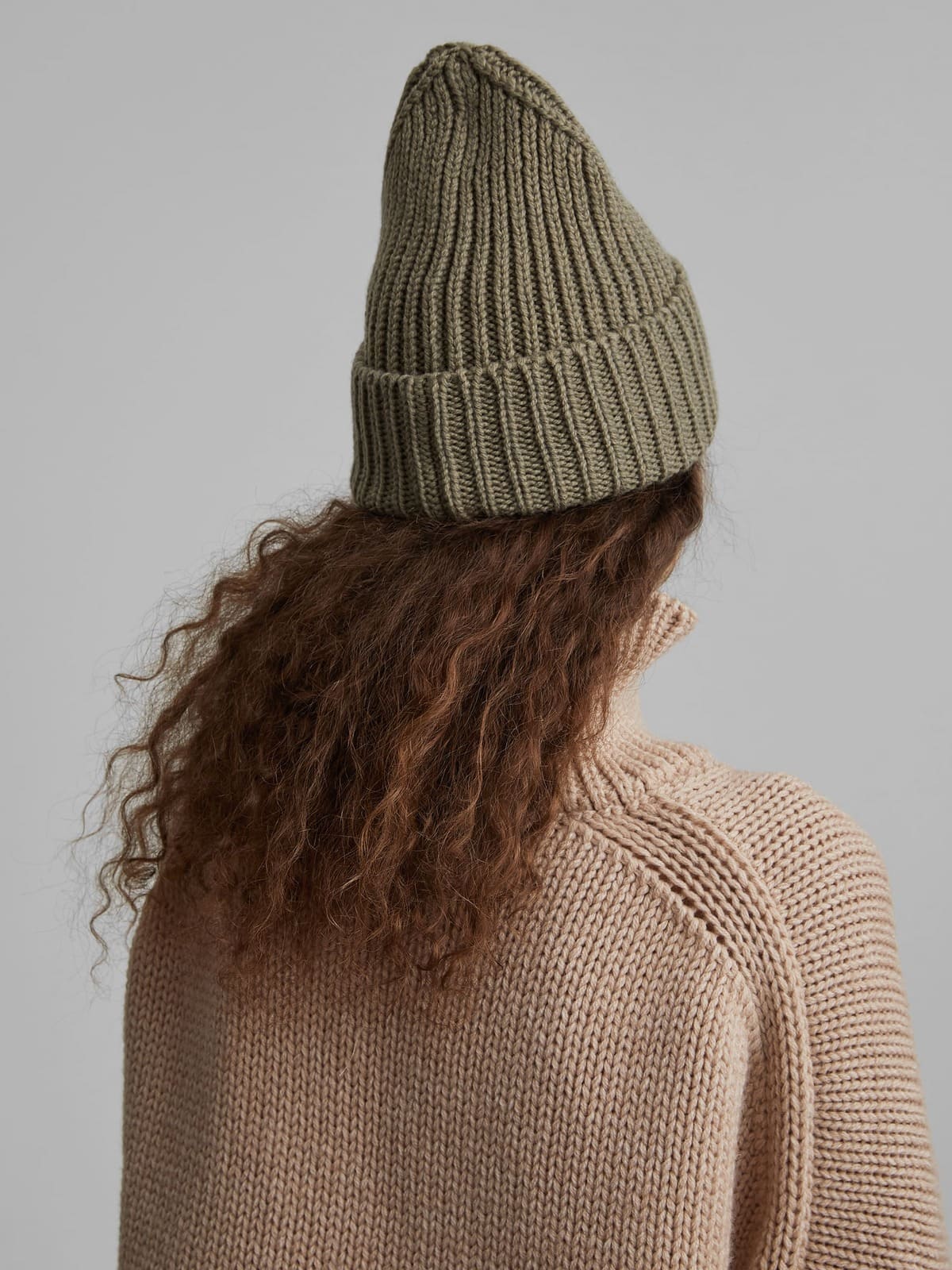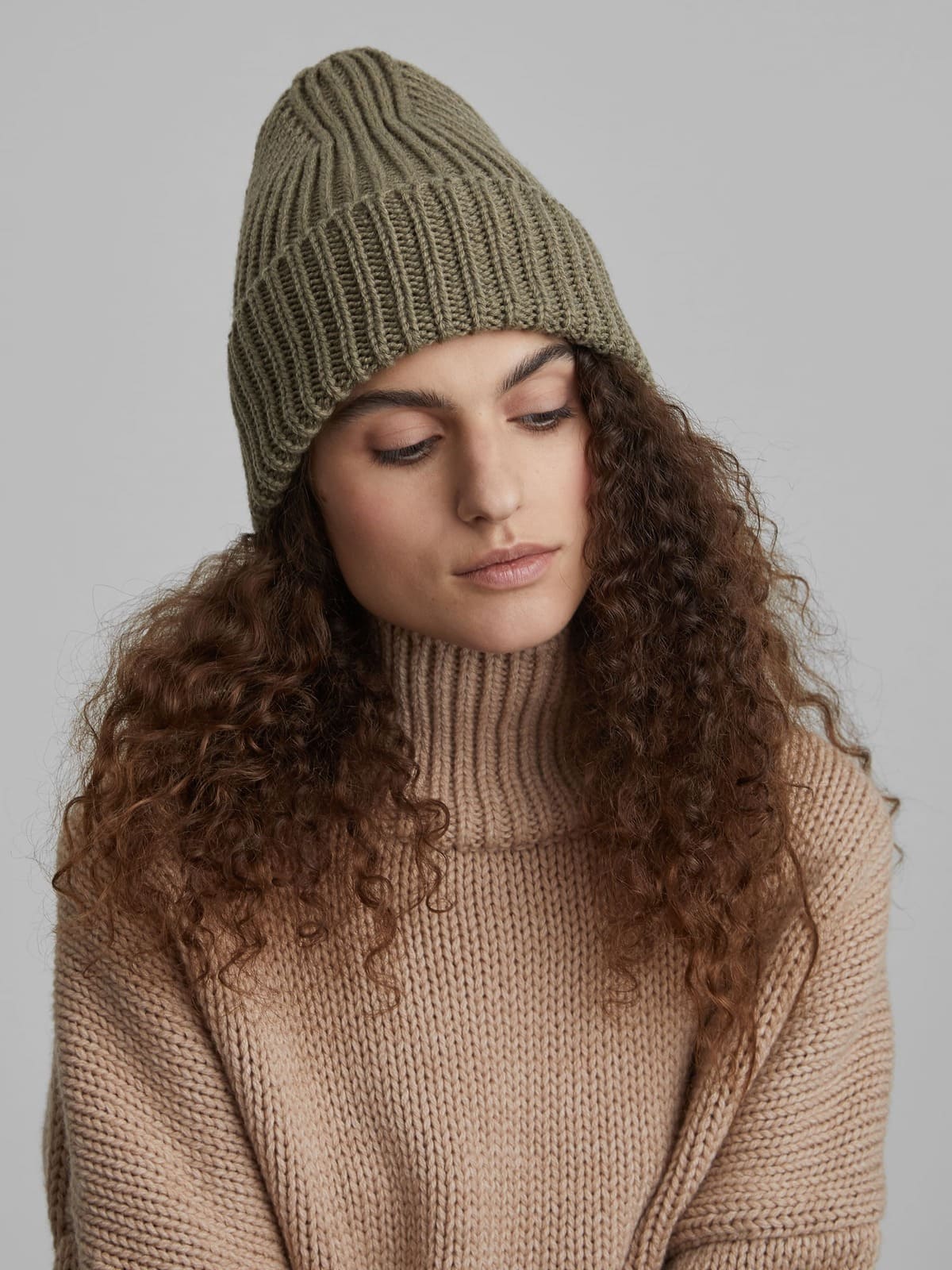 Шапка-бини крупной вязки, имеет универсальную форму и объёмную посадку.
