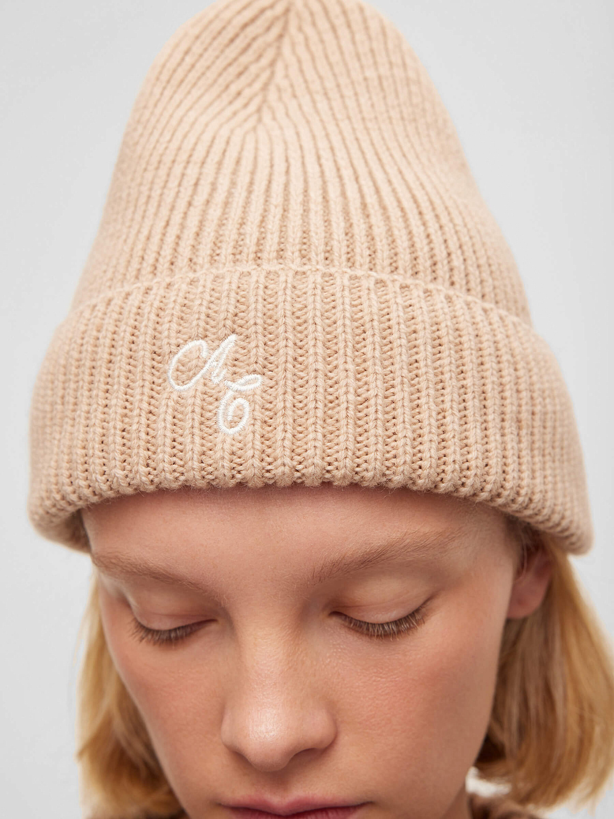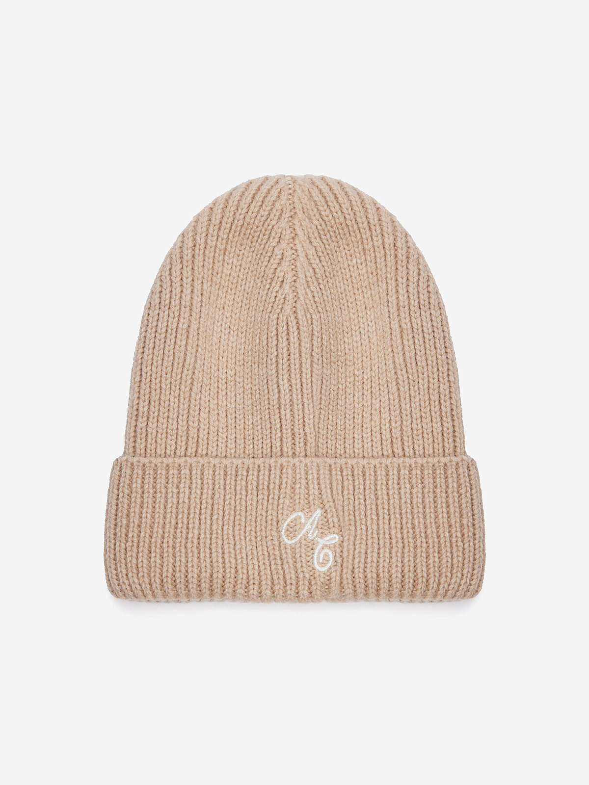 Шапка в рубчик с отворотом и вышивкой, бежевый