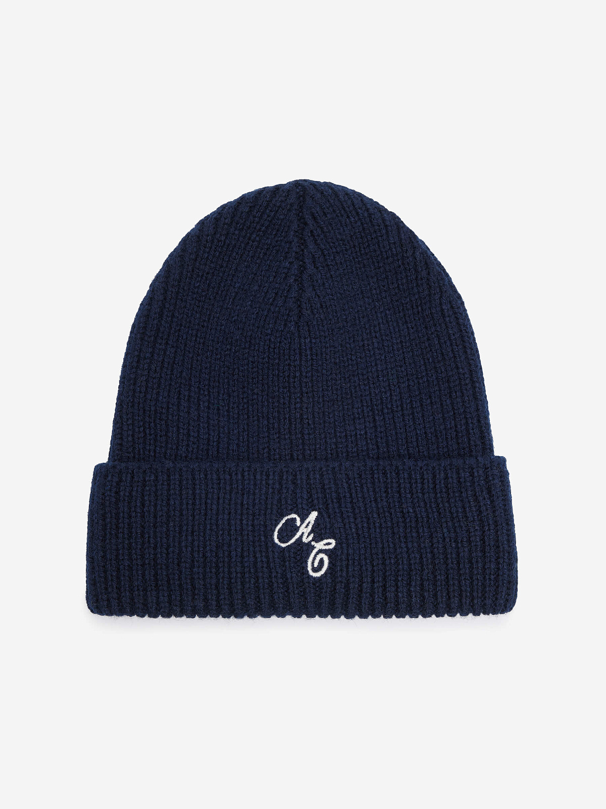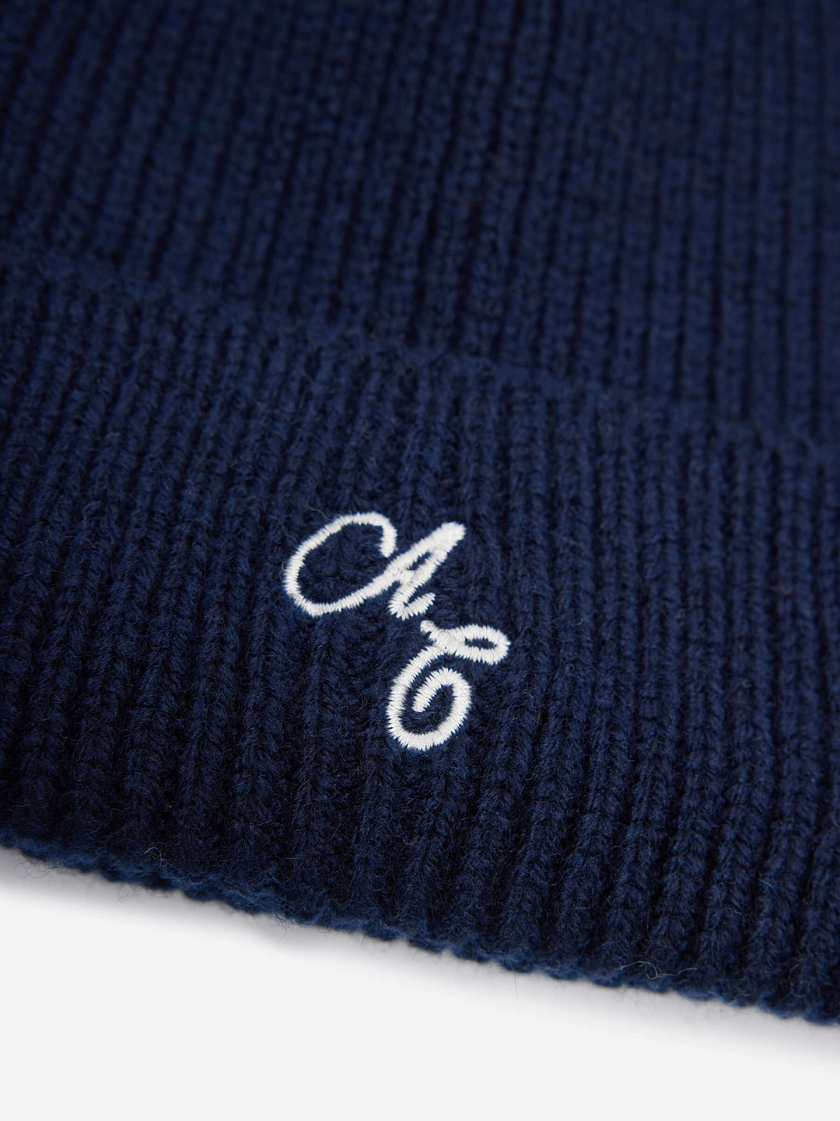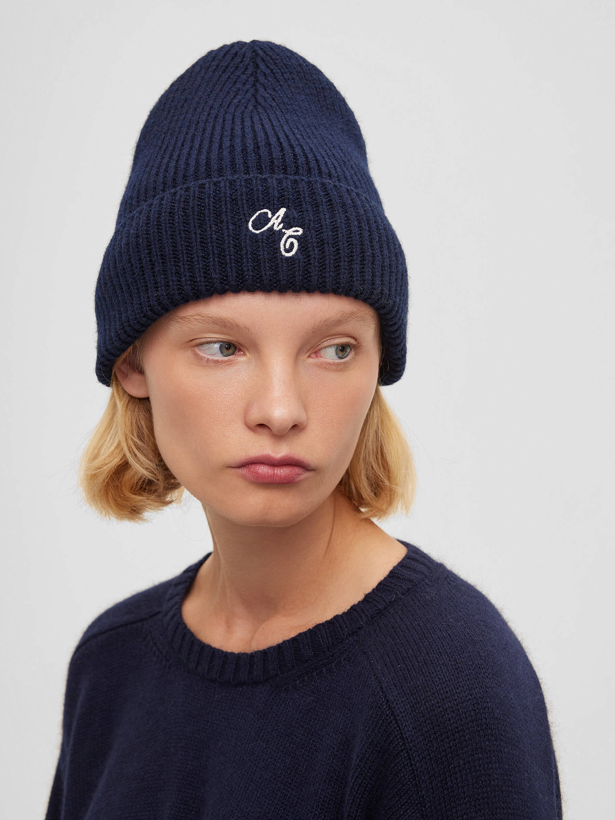 Шапка в рубчик с отворотом и вышивкой, темно-синий