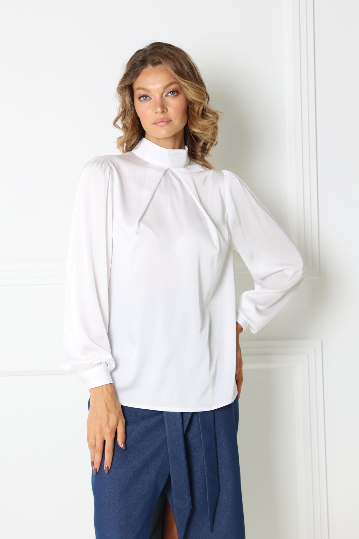 Блузка с высоким воротом стойкой и застежкой на 2 пуговицы. Защипы от воротника по переду. Втачной рукав с манжетой на пуговице.