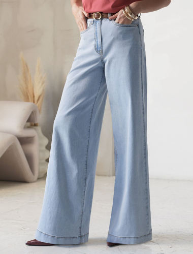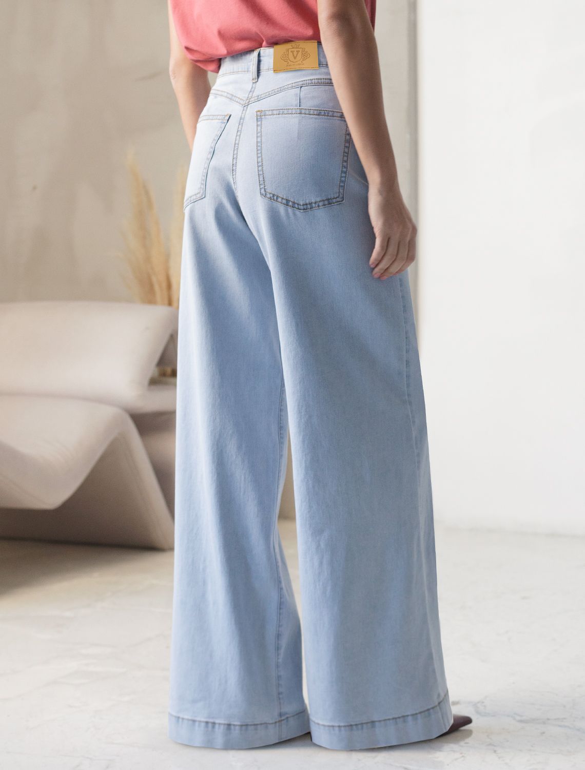 Широкие джинсы светло-голубого цвета выполенены из облегченного денима плотностью 8 OZ, они идеально подходят для весны и лета. После пошива изделие подвергли специальному виду вошинга — salt-stone washing (солт-стоун вошинг), что дословно значит стирка с каменной солью. Такой вид вошинга позволяет получить стильные потертости на голубых оттенках денима. Свободные джинсы идеально подойдут для девушек и женщин размера plus size (плюс сайз) с широкими бедрами, скроют недостатки и подчеркнут достоинства фигуры, Высокая посадка и прямой крой визуально вытягивают силуэт. Качественная надежная фурнитура делает добавлет образу премиальности. Широкие легкие джинсы не стесняют движений, позволяя чувствовать себя комфортно даже в жаркую погоду. Базовые летние джинсы не только удобные, но и практичные для повседневной носки, благодаря натуральному материалу и продуманному крою. Джинсы трубы всегда актуальны и незаменимыми для базового гардероба.