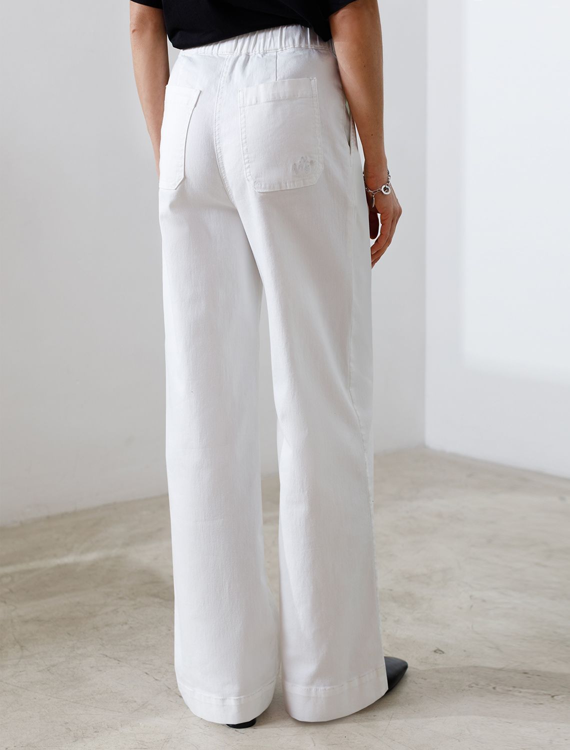 Широкие джинсы белого цвета выполенены из облегченного денима плотностью 8 OZ, они идеально подходят для весны и лета. Особенность модели — пояс на мягкой резинке, который гарантирует удобство в области талии. Джинсы дополнены защипами на поясе, которые формируют актуальный свободный крой. Джинсы палаццо идеально подойдут для девушек и женщин размера plus size (плюс сайз) с широкими бедрами и скроют недостатки, Высокая талия с защипами визуально корректирует фигуру и вытягивает силуэт. Качественная надежная фурнитура делает добавлет образу премиальности. Широкие легкие джинсы не стесняют движений, позволяя чувствовать себя комфортно даже в жаркую погоду. Джинсы палаццо — идеальный баланс между расслабленным стилем и элегантностью, вариант для тех, кто ищетдостойную альтернативу классике на каждый день.