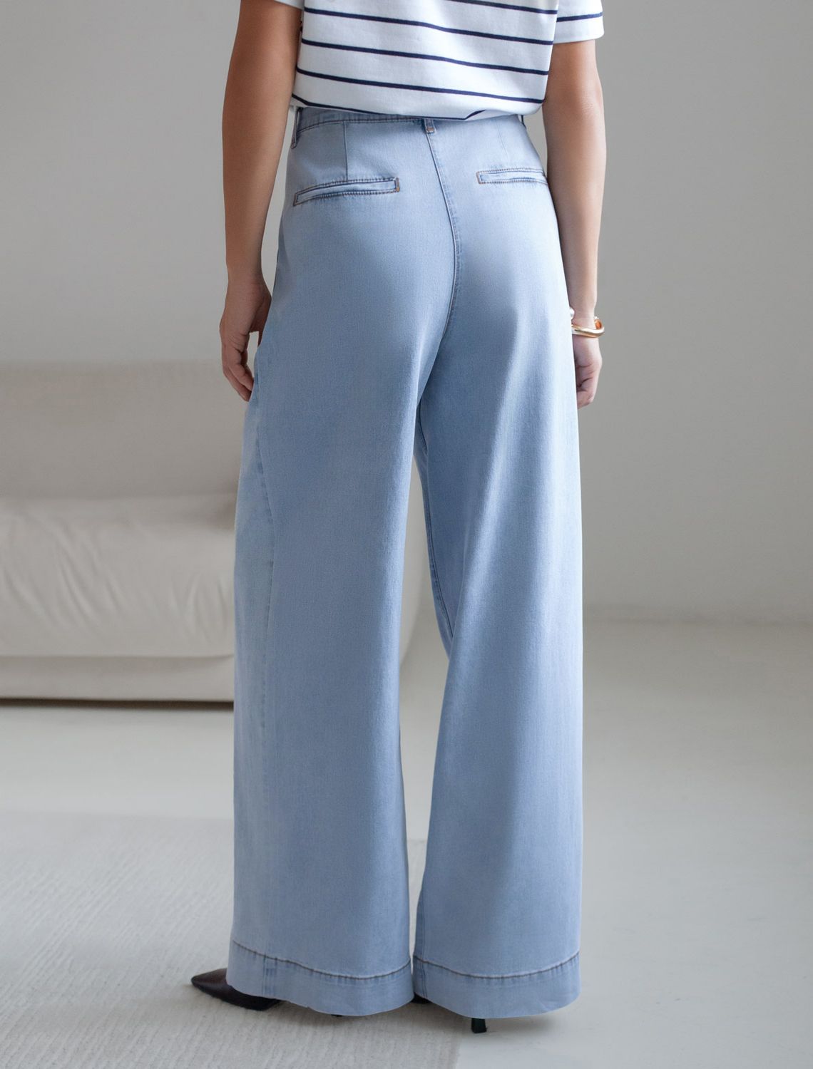 Широкие джинсы белого цвета выполенены из облегченного денима плотностью 8 OZ, они идеально подходят для весны и лета. После пошива изделие подвергли специальному виду вошинга — salt-stone washing (солт-стоун вошинг), что дословно значит стирка с каменной солью. Такой вид вошинга позволяет получить стильные потертости на голубых оттенках денима. Модель дополнена защипами на поясе, которые формируют актуальный свободный крой. Джинсы палаццо идеально подойдут для девушек и женщин размера plus size (плюс сайз) с широкими бедрами и скроют недостатки, Высокая талия с защипами визуально корректирует фигуру и вытягивает силуэт. Качественная надежная фурнитура делает добавлет образу премиальности. Широкие легкие джинсы не стесняют движений, позволяя чувствовать себя комфортно даже в жаркую погоду. Джинсы палаццо — идеальный баланс между расслабленным стилем и элегантностью, вариант для тех, кто ищет достойную альтернативу классике на каждый день.