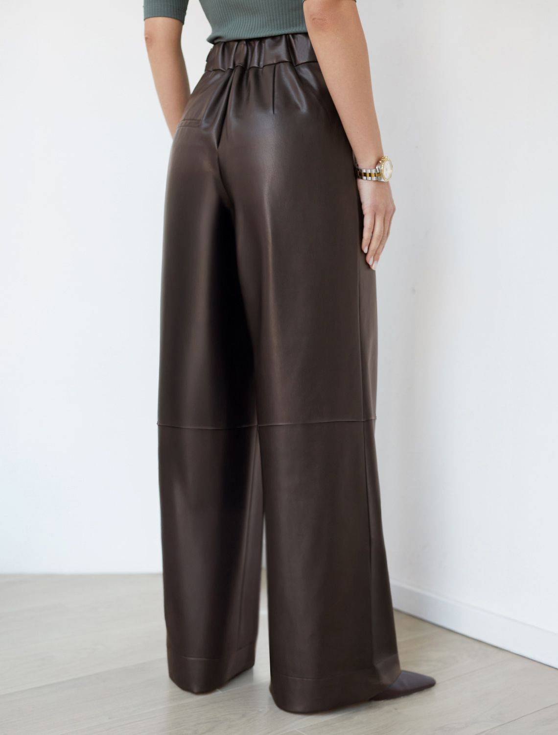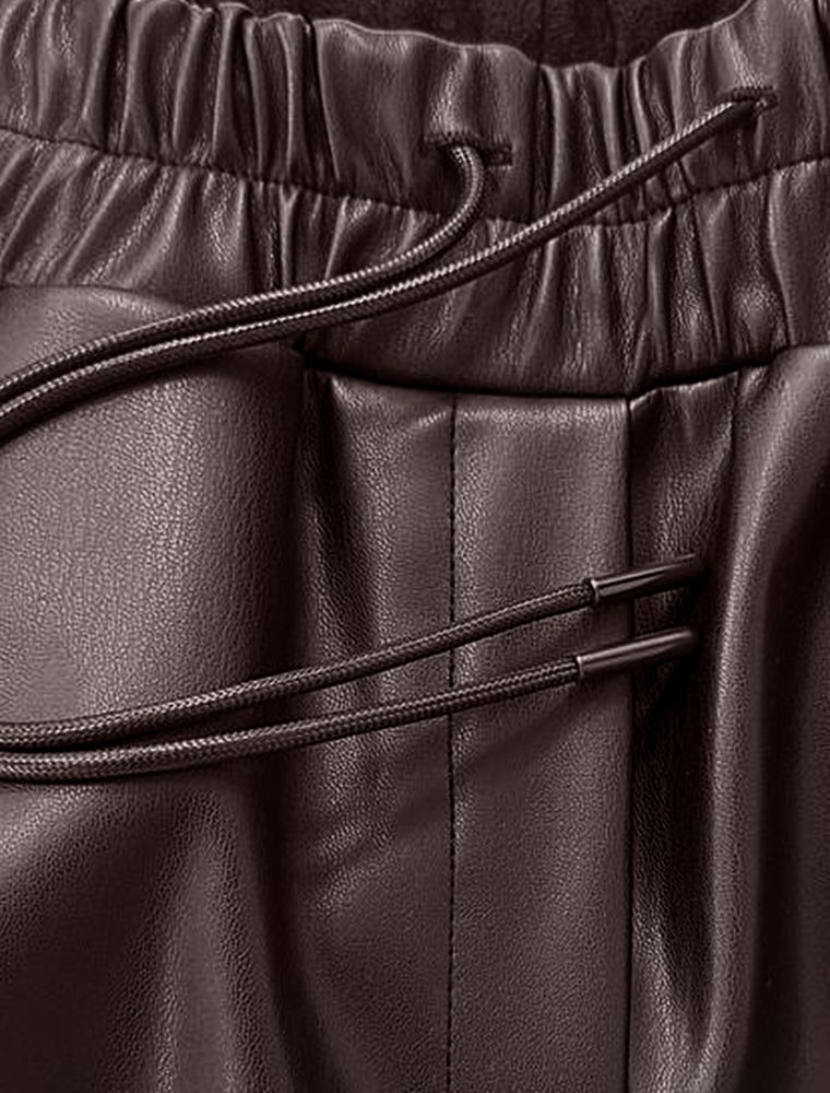Трендовая модель для смелых модных образов. Эти брюки из качественной искусственной кожи создают бунтарский урбанистический лук. Модель с высокой посадкой на поясе и равномерно широким клешёным силуэтом от бедра до низа визуально вытягивает фигуру. Мягкая подкладка пояса обеспечивает комфорт, не сдавливая талию. Универсальный коричневый цвет легко комбинируется с объемными худи, кроп-топами или лаконичными рубашками. Идеальны для создания образов в стиле гранж.